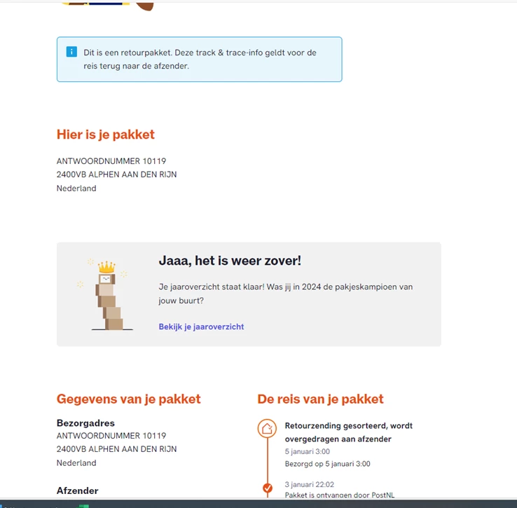Bij de track trace van post nl staat dat het pakket op 17 januari weer verzonden is naar :