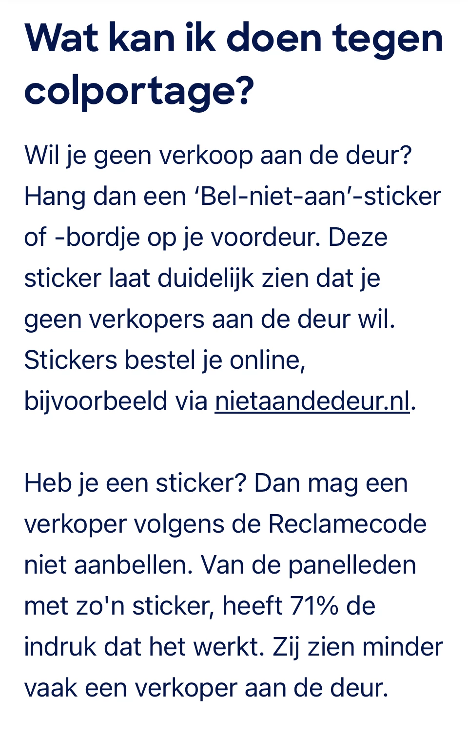 Ik heb onlangs een klacht ingediend. Ik heb een colportage-sticker bij de deur, (ook een videobel alles opgenomen) maar nog werd er aangebeld door een verkoper van een loterij en op mijn vraag of hij de sticker niet heeft gezien werd er doodleuk gezegd “jawel maar” … waarop ik de deur voor z’n neus dicht deed met de mededeling geen interesse te hebben en van diezelfde loterij zijn ze daarna nog 3x in dezelfde week bij mij aan de deur geweest. Hondsbrutaal.