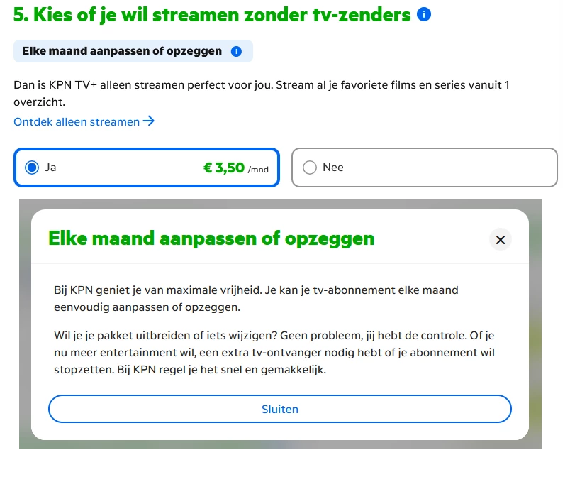 Als je kiest voor een KPN box en je kiest voor alleen streamen, en je denkt ik wil eigenlijk ook wel tv er bij, dan dan moet je een maand wachten. Is dat geen rare strategie KPN. Mensen hebben al een box in huis voor de streamingsdiensten, en willen dan TV erbij, dat hoeft alleen maar geactiveerd te worden op die box. Er zit geen logistieke actie aan vast in de zin van dat er iets moet wordt toegestuurd of zo. De klant wil neem ik aan zo snel mogelijk TV erbij en niet een maand hoeven wachten, en het kost KPN ook geld want het hogere abonnement gaat pas een maand later in.