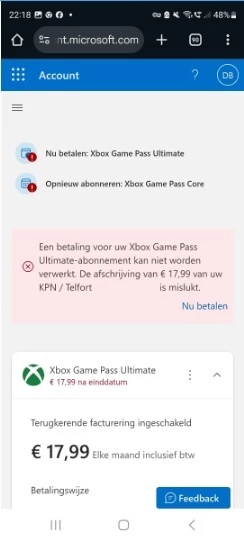 Help weet niet wat ik moet doen betaal ervoor xbox ultimate en toch aangeven dat de betaling is mislukt hier het bewijs wat moet ik nu doen mijn bewind heeft het goed geregeld met kpn maar dit is niet leuk dat die dit blijft aangeven steeds terwel ik ervoor betaal ik wil kunnen spelen🄺