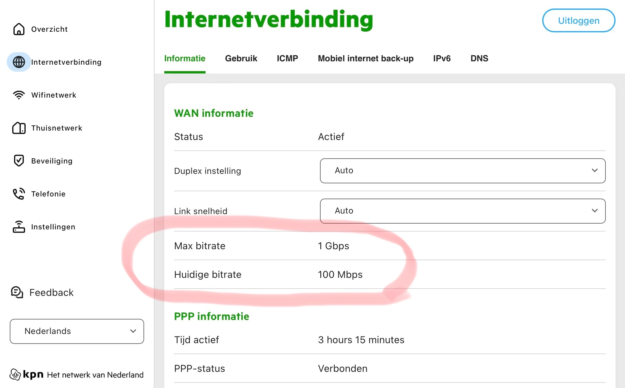 Om uit te sluiten dat er of laptop of netwerk kabel niet goed is ben ik zelfs naar mijn collega geweest die ook KPN heeft en daar haal ik gewoon volle snelheid met mijn laptop bedraad. Ik kan dan met zekerheid zeggen dat het niet aan mijn laptop of netwerk kabel ligt.