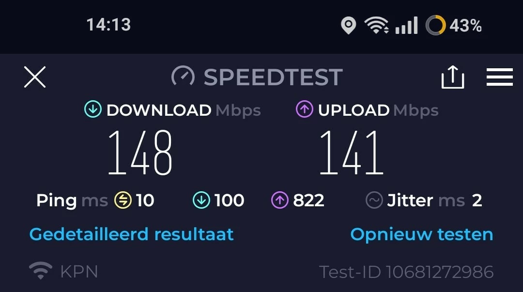 Dank voor uw bericht. Ik heb via de KPN site een speedtest gedaan en via de site Ookla. Zowel deze testen op de pc gedaan als via de wifi op mijn telefoon. Ik heb alles geprobeerd. Mijn modem helemaal gereset, het glasvezel kastje van de stroom gehaald maar niets helpt helaas. Alle kabels ook gecontroleerd en daar ligt het ook niet aan. Ik hoop dat ik hulp kan krijgen wellicht kan iemand kostenloos bij mij langskomen om alles te controleren. Ik weet niet meer wat ik moet doen. Dank u wel