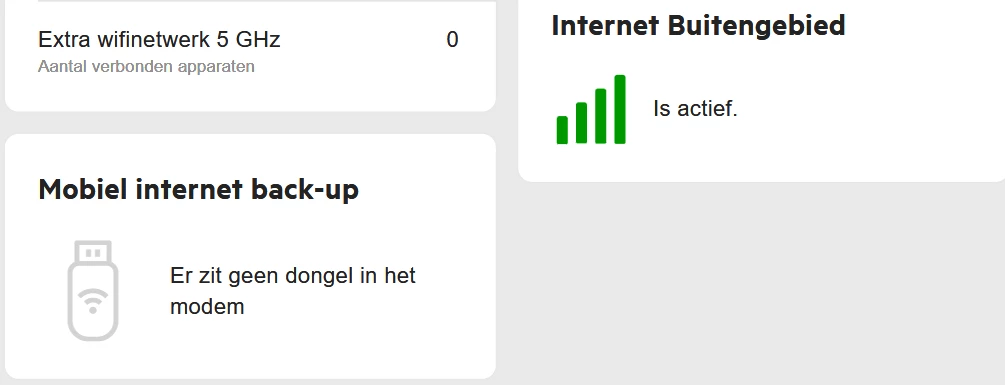 Alle lampjes branden blauw, en ik heb twee streepjes bij signal. Aan de achterkant naast de plug branden een groen en oranje lampje. Als ik naar mijnmodem.kpn ga, zie ik in het tabje “mobile internet backup”, dat de status “NotPresent” is, misschien is dat een clou?