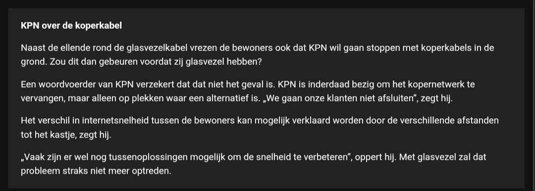 In die brief lees ik een een ander verhaal, er is wel glasvezel maar is nog niet aangesloten, dus gewoon even bellen naar KPN en vragen om migratie van koper naar glasvezel. ​@Fer2011