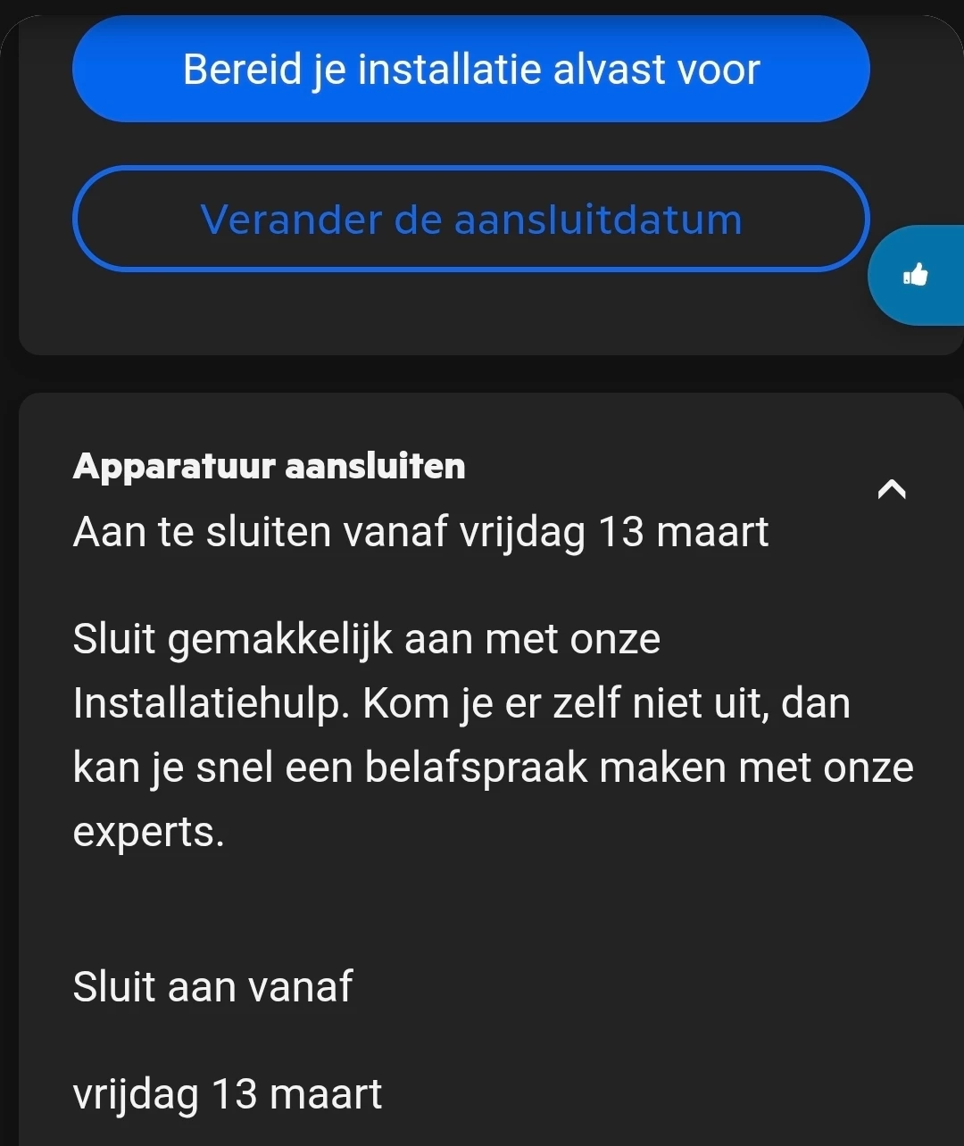 13 maart komt er al mooi snel aan. Voor sommige mensen is 13 ook een geluksgetal hè ;) Ik noem een Jorrit Bergsma en zie hoe dat uitgepakt heeft. Dus ik heb voor jou ook goede hoop. Als je nog wat meer informatie wilt, dan kun je altijd even bellen met KPN Netwerk. Zij kunnen je doorschakelen met de aannemer.