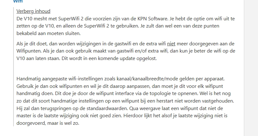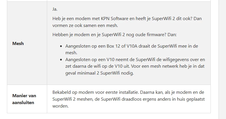 @Arjan van KPN. Ik heb een experiabox v10 op kpn software V10.C.25.01.05. Deze hangt in de meterkast op de begane grond. Wifi op 1e verdieping is erbarmelijk en daarom heb ik gister SuperWifi2 Huur erbij besteld. Bij het bestellen gaf de site advies om per verdieping 1 wifipunt te hebben. En het modem zou daarbij ook tellen als wifipunt. Nu heb ik de SW2 ontvangen en daar staat in de handleiding dat deze echter de wifi van  v10 modem overneemt en ook altijd bekabeld aangesloten moet worden. Dat spreekt elkaar tegen. Kun je a.u.b. uitsluitsel geven voor ik de SW2 ga aansluiten.