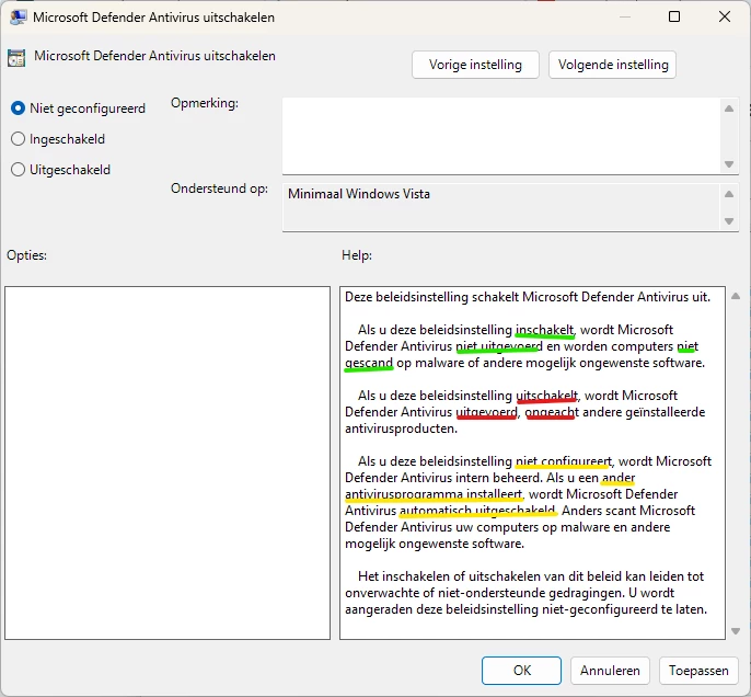 Windows (Defender) zet verschillende componenten van Defender in een monitor stand zodra gezien word dat er een andere Antivirus/Malware oplossing op de machine staat.