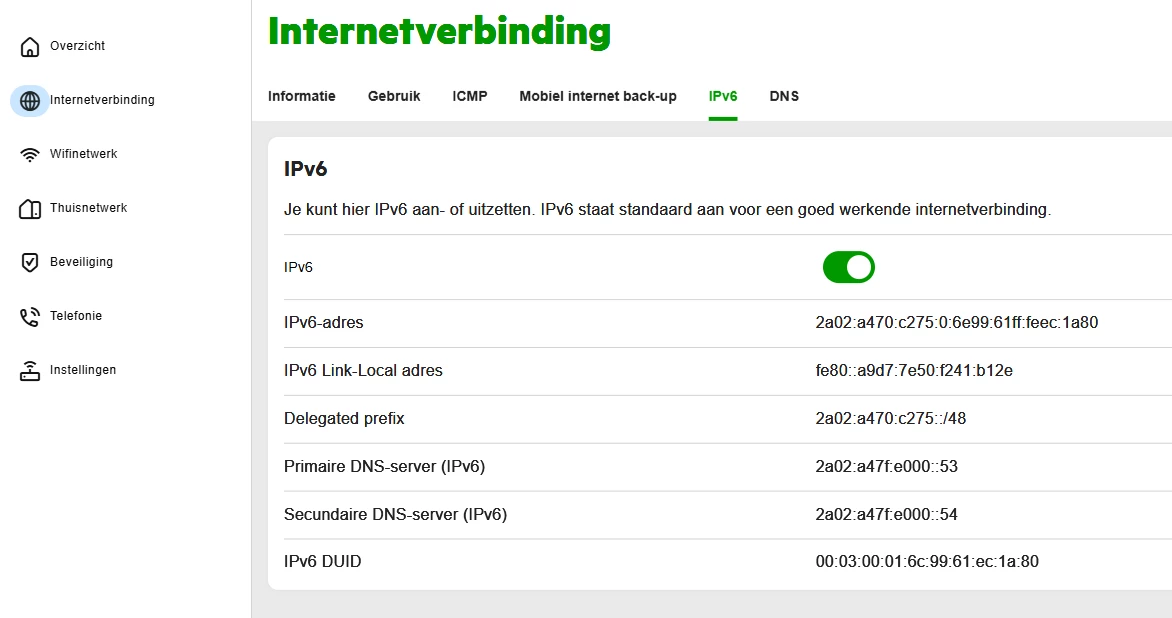 Ik wil toch even controleren of IPv6 daadwerkelijk uit is gezet. Ga op je pc/laptop, dus niet op je mobiel, naar 192.168.2.254 of mijnmodem.kpn, log daar in en controleer of het daadwerkelijk uit is gezet. Zie hieronder.