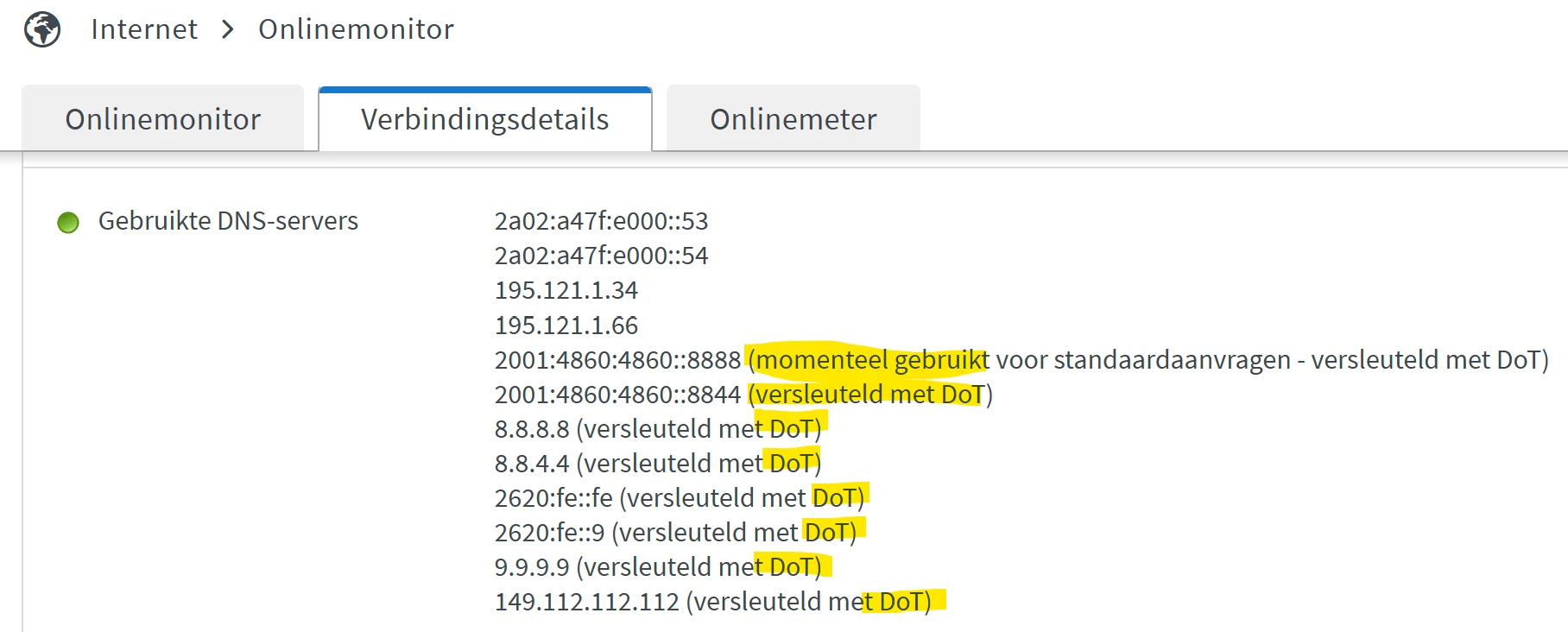In een Fritz!Box geeft de Online Monitor aan welke DNS-servers gebruikt worden.