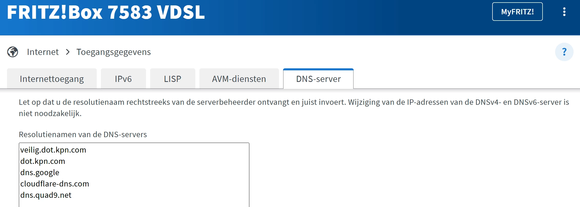 Mijns inziens kan je het beste de anti-malware DNS servers gebruiken en als je de DoT DNS servers van KPN wilt gebruiken dan is dat dus de veilig.dot.kpn.com.