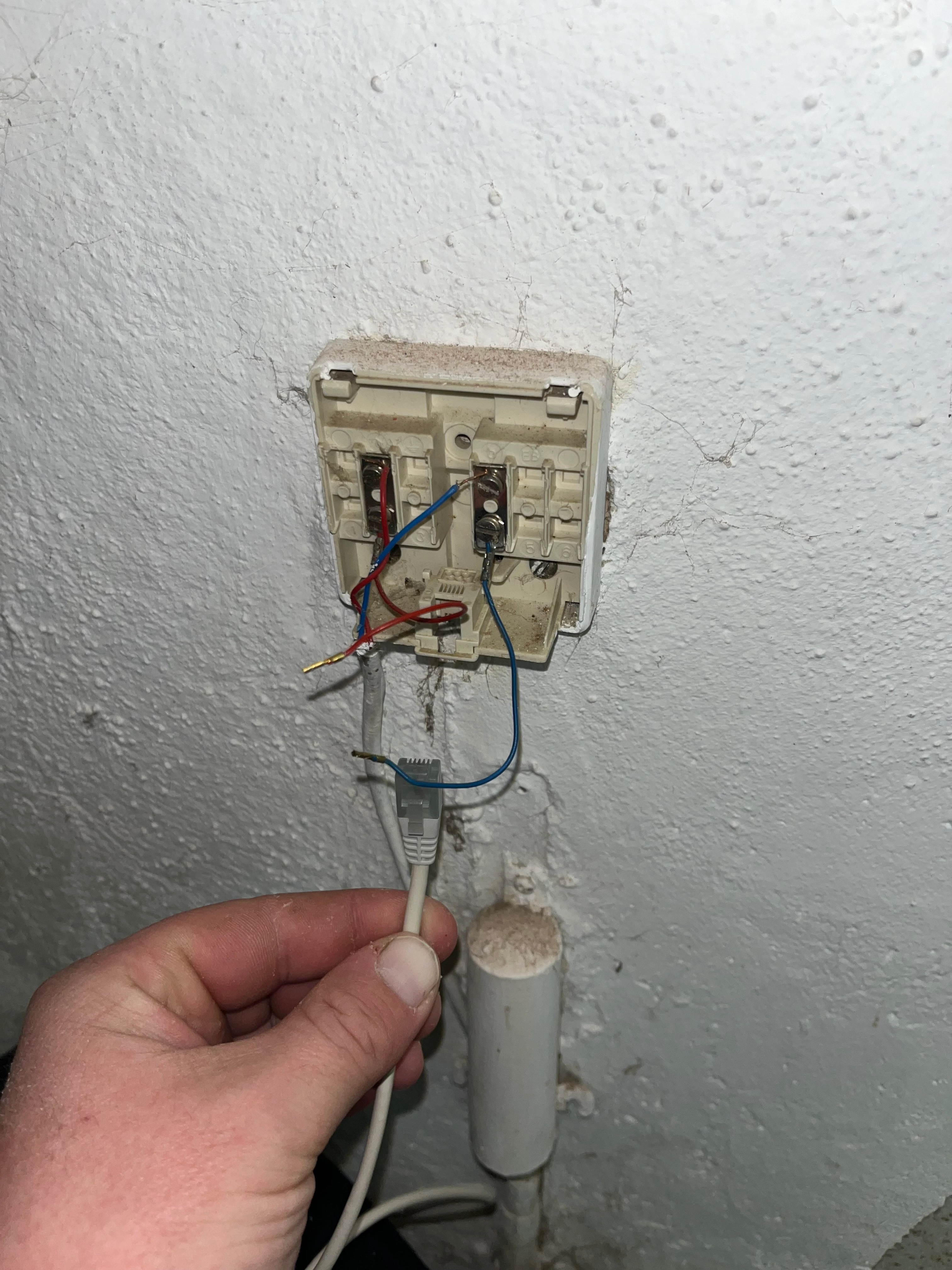 De internetkabel in mijn hand moet onder in het kastje, maar die stekker zit niet aangesloten omdat het rode en de blauwe draad los zitten. Waar moet ik die aan bevestigen om weer contact te maken met de internetkabel in mijn hand ?