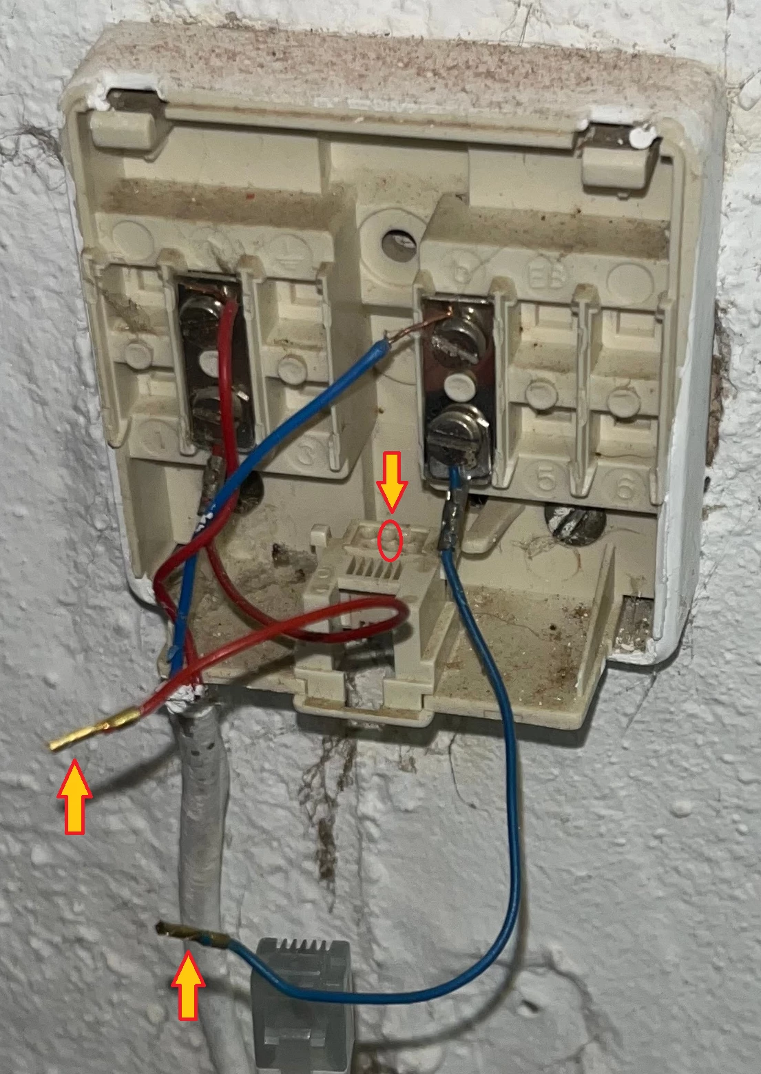 Zo te zien in de middelste 2 aansluitingen die ik rood omcirkelt heb, die zouden op de middelste 2 contacten van de RJ11 poort moeten uitkomen.