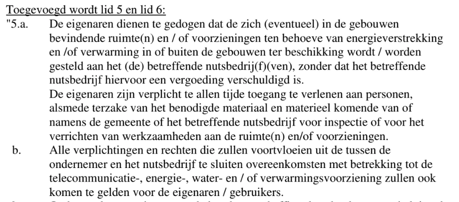 Ik begrijp dit niet helemaal. Eigenaren van ‘tussenliggende appartementen’ in hoogbouw moeten gelegenheid geven om NUTS voorzieningen, ook glasvezel!, door te laten voor bovenliggende etages. Ook wanneer deze zelf geen aansluiting wensen.