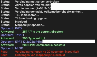 Op dit plaatje lukt inloggen wel, maar mappenlijst kan niet worden opgehaald. Dit wil zeggen dat de verbinding via poort 21 goed werkt.