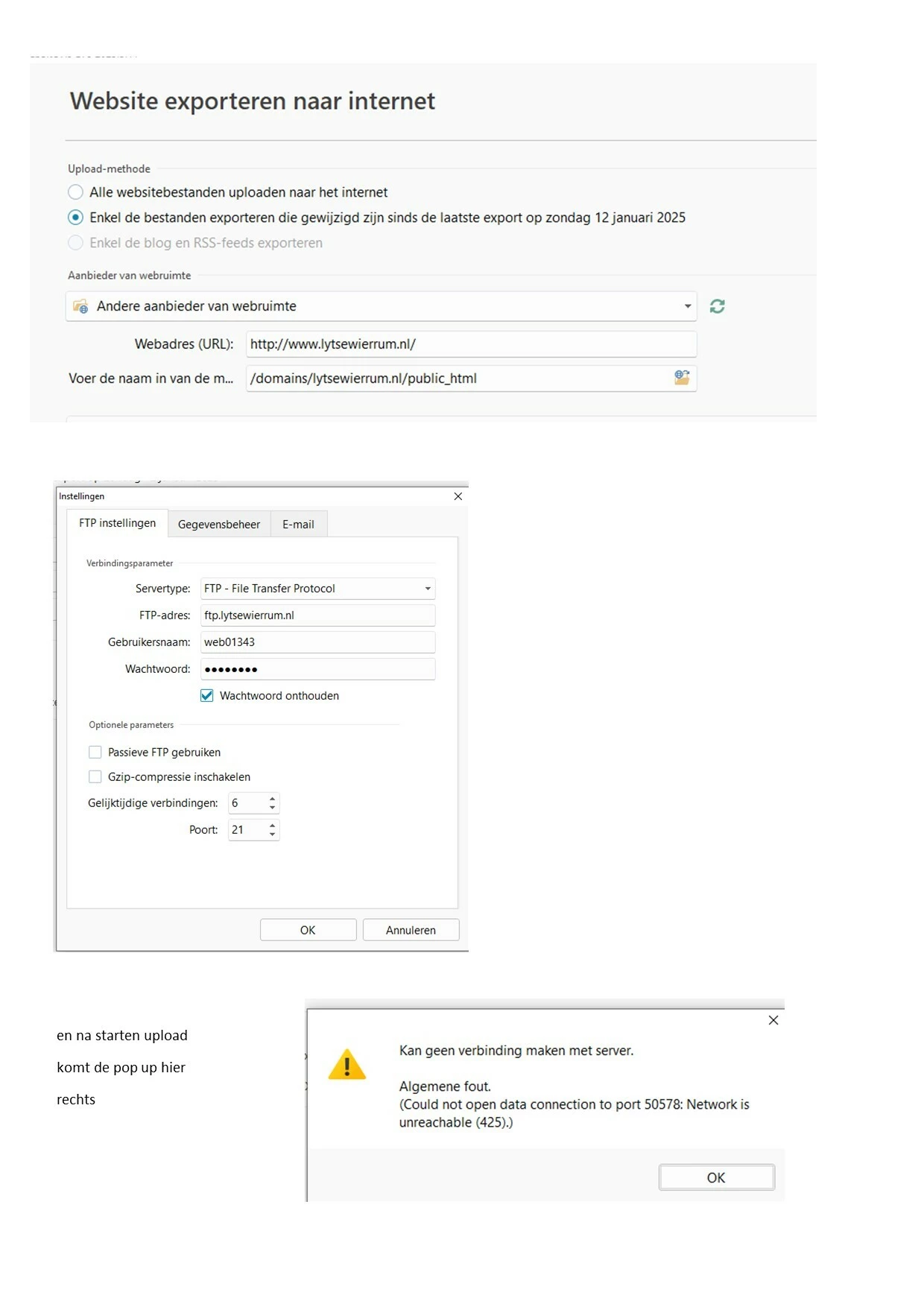 -En heb al geprobeerd via SFTP verbinding te maken, maar dan melding 'kan geen verbinding maken met server’ net als voorheen bij FTP.