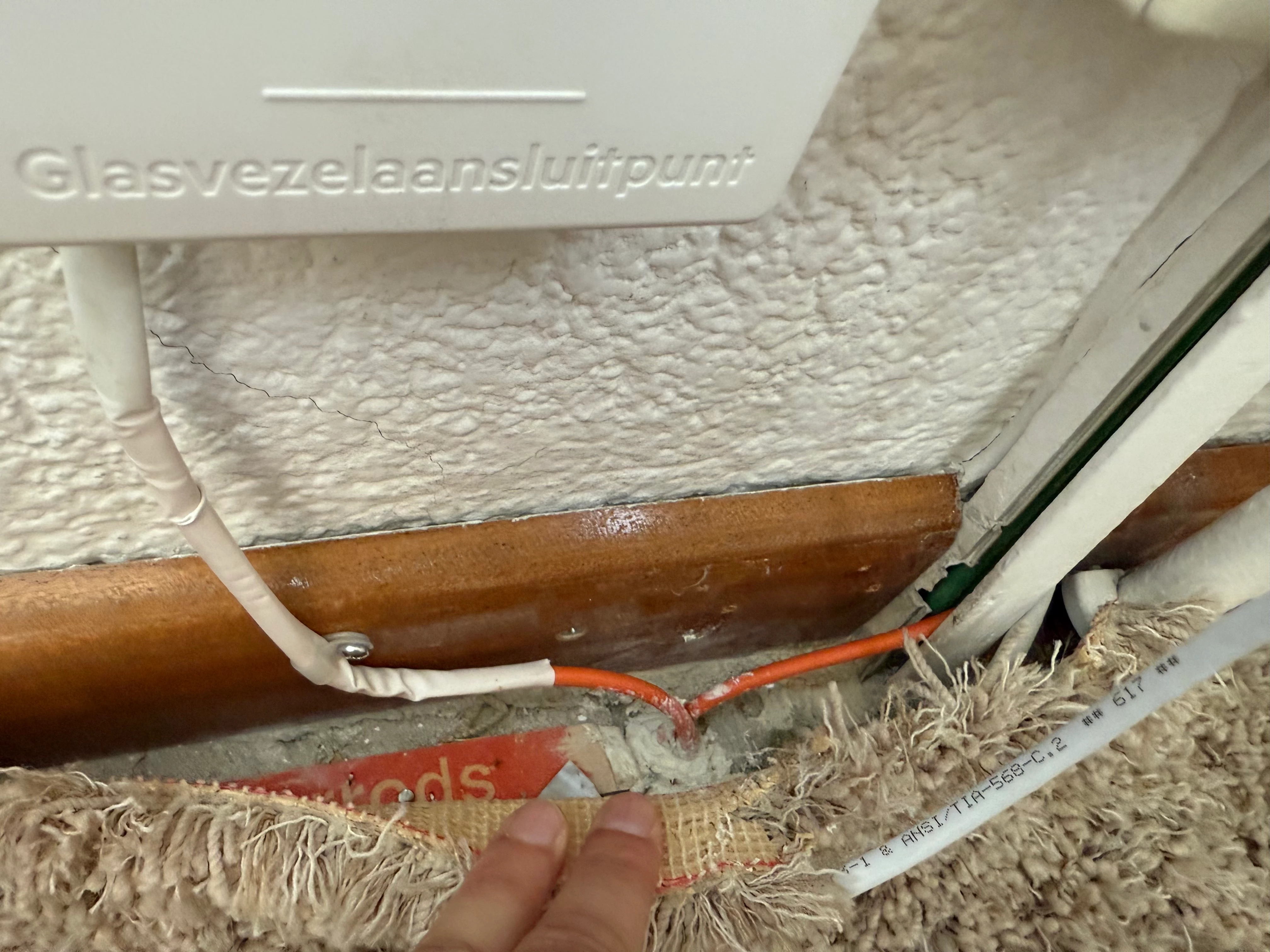Klopt helemaal wat je zegt, ​@RBxx, dit lijkt inderdaad nergens op. Onze bouwkundige van de VvE heeft e.e.a. al bekeken en gaat met de uitvoerder praten om dit verder te fixen. De bedoeling was om de vezel van ons naar boven de leiden, via de goot waarin ook coax zit, echter… daar had ik ze al een beetje voor gewaarschuwd, er zit brandwerende pasta in de goot, dus… dat ging niet, dan maar een gat geboord naar boven. Dat ziet er ook niet uit.