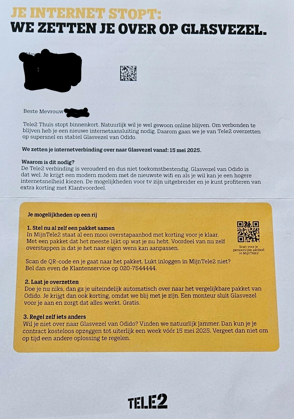 Ik gebruik dsl van tele2.In mei 2025 stopt dit abonnement en moet ik overstappen op glasvezel.Dit heeft te maken met end of sale afspraak omdat tele2 gebruik maakt van de kpn-kabel.?l