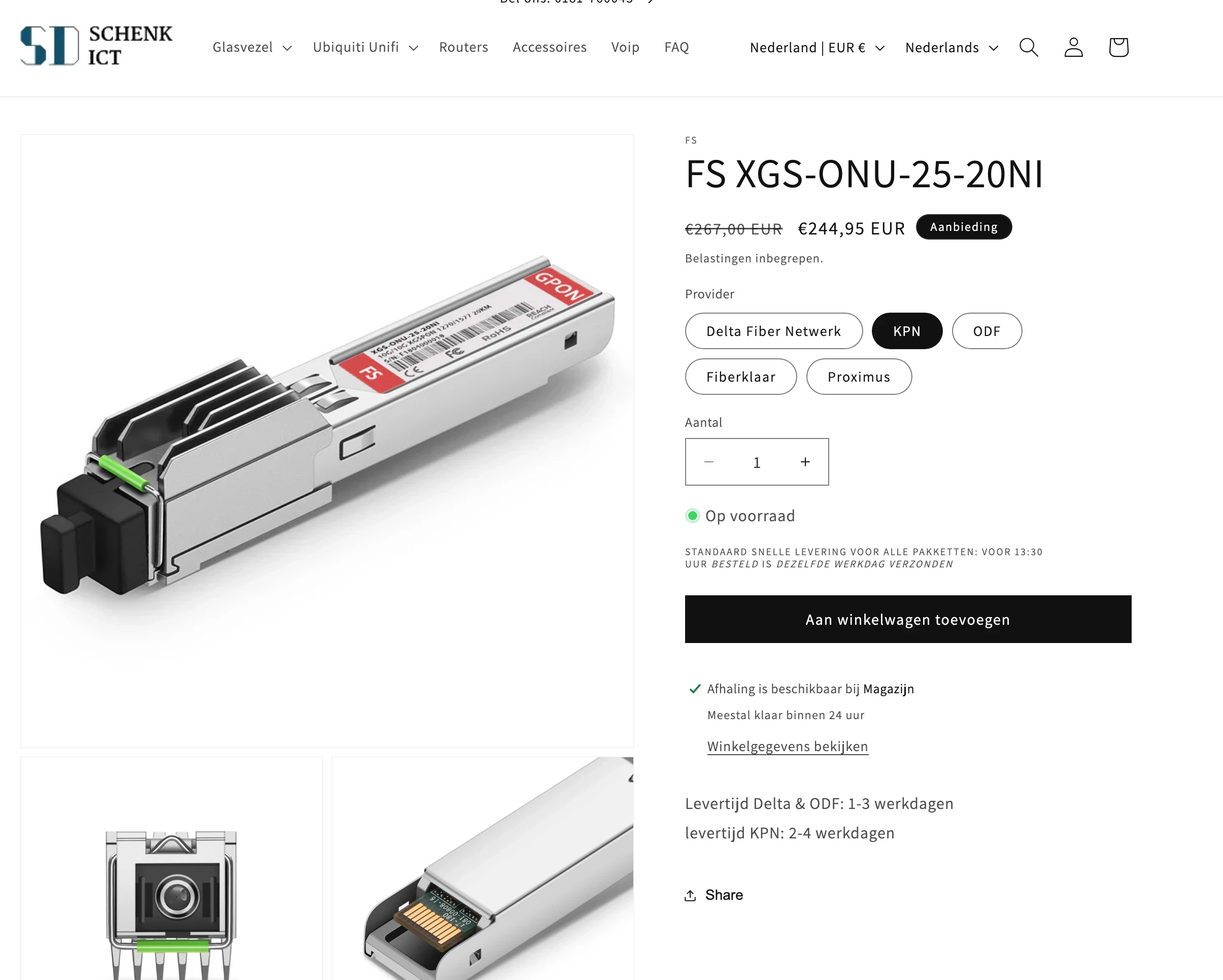 Wat ik een beetje begrijp, maar waar ik nog niet precies de vinger op kan leggen, is dat deze voor KPN een andere configuratie heeft. Je moet ze echt apart bestellen voor Delta en KPN. Het is zelfs zo dat Delta binnen 1 Ć  3 dagen leverbaar is en KPN in 2 tot 4 dagen. Ik weet dat SFP+ modules inderdaad te beschrijven zijn met instellingen, maar dat vraagt wel professionele apparatuur. Wat ze precies instellen durf ik niet te zeggen, maar het is zeker wat onderzoek waard.