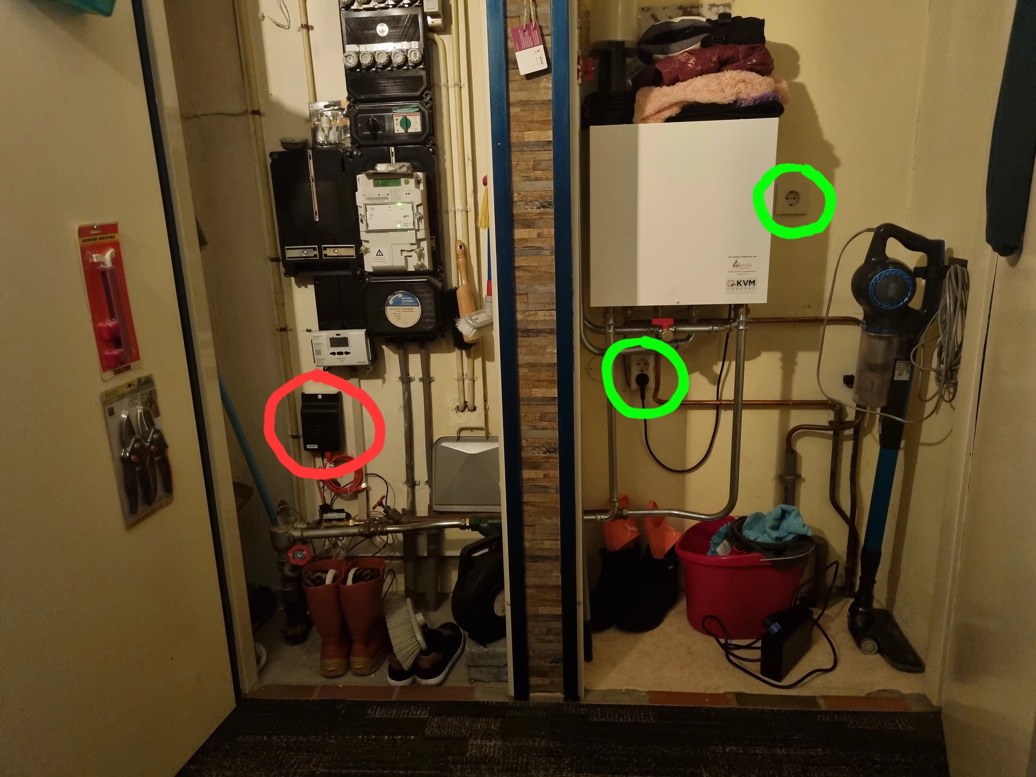Zoals je kunt zien hangt het glasvezelkastje (rood) links in een volle meterkast zonder stopcontacten, terwijl er een lege kast direct naast zit met twee stopcontacten (groen). Deze ruimte werd vroeger gebruikt voor een boiler.