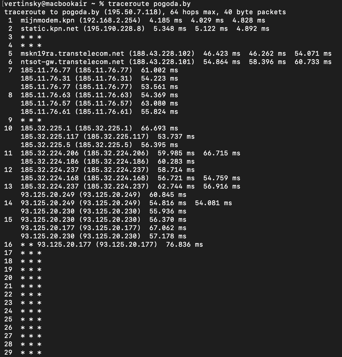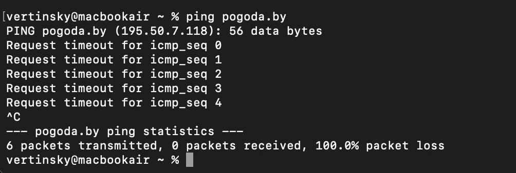 Dat je 100% packet loss hebt bij pogoda.by kan wel kloppen want die server reageert niet op ICMP packages (ping). Dus dat is normaal. IP is verder wel correct dus dat zou het probleem niet kunnen zijn.
