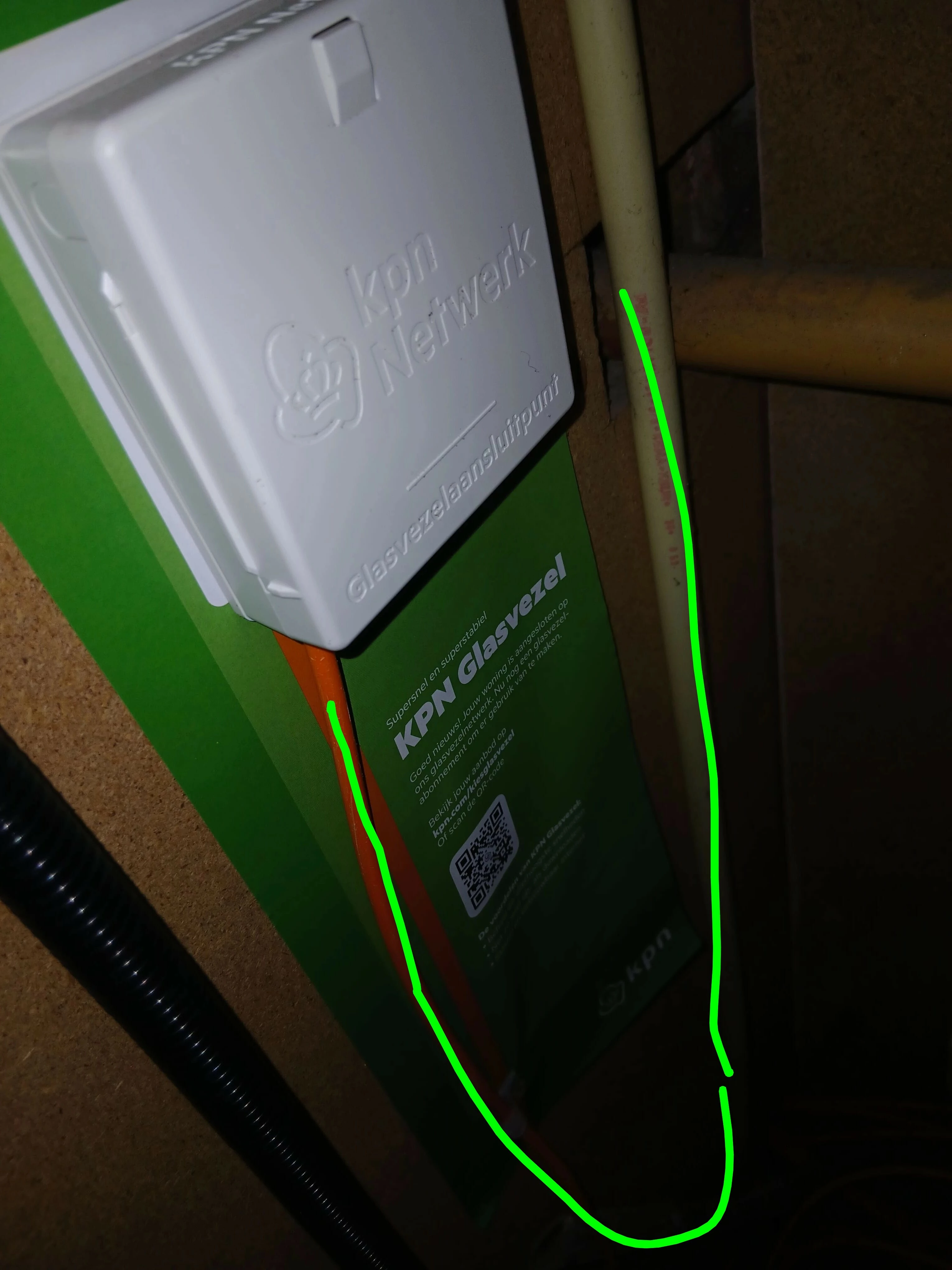 Netjes is het niet, maar dit is inderdaad de kabels voor je direct bovenburen. Zijn deze al aangesloten op glasvezel? Loopt de kabel al naar boven? Als dat zo is zou ik contact opnemen met KPN afdeling netwerk, want dan hoort dit niet. Als dat nog niet zo is en dit is pas aangelegd verwacht ik dat het in de komende dagen/weken wordt doorgetrokken naar boven.