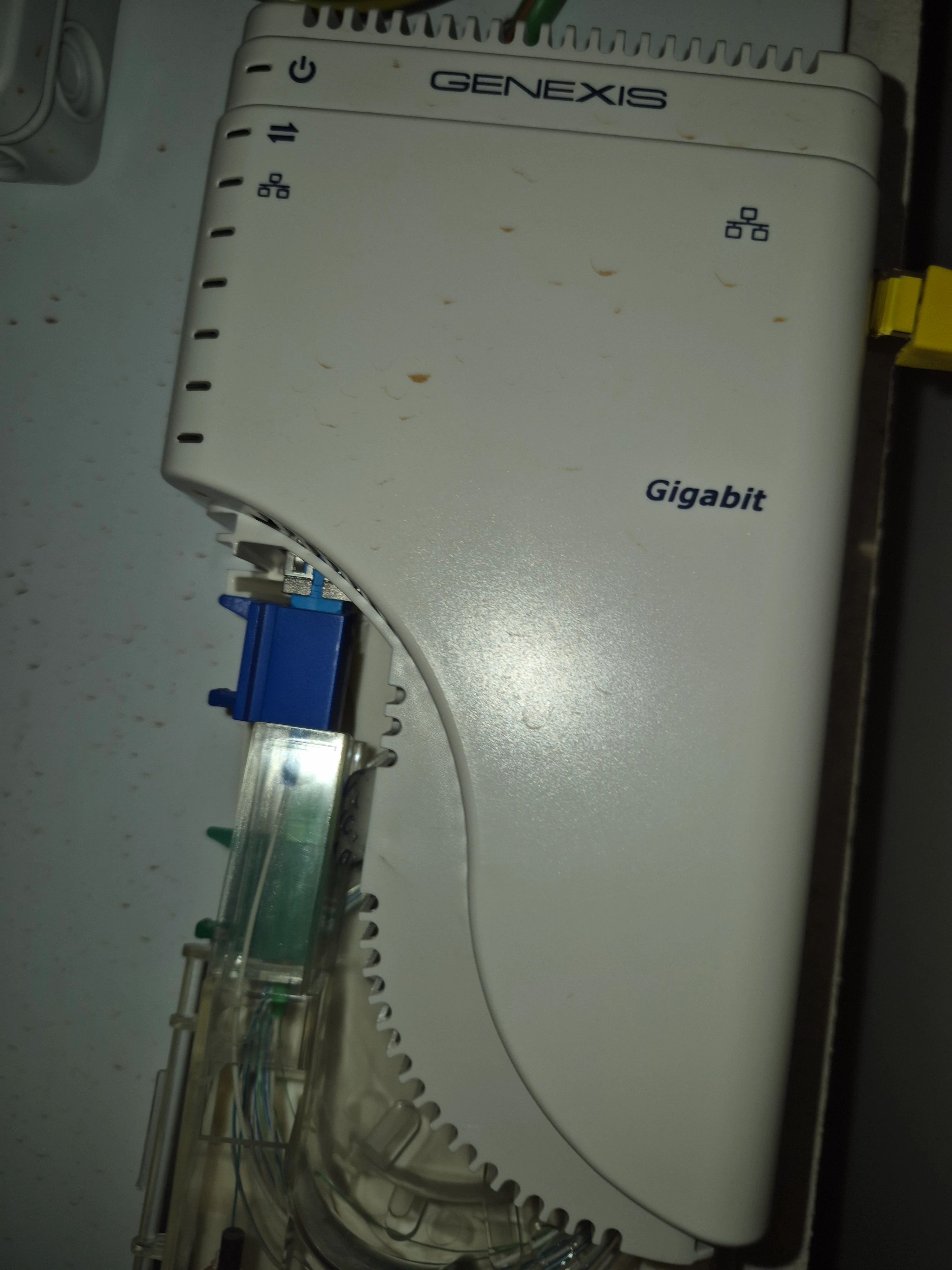 Ik probeer de modem aan te sluiten, nu heb ik al internet zonder wifi. Echter lijkt het glasvezelkastje uit te staan en ik kan geen aan knop of iets dergelijks vinden. Zie foto voor glasvezelkastje.