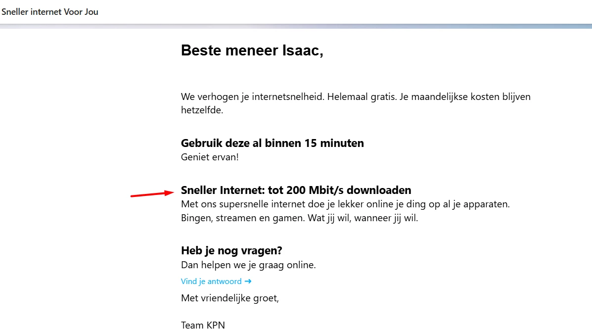 Ik kreeg een bericht dat KPN mijn glasvezelinternet gratis verhoogt van 100 MB/100 MB naar 200 MB/200 MB.