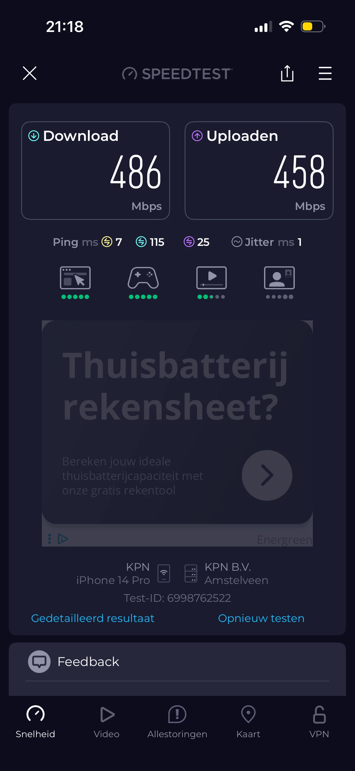 Ik zit al de hele week te kijken waar het aan kan liggen, maar kan er de vinger er niet opleggen. Ik heb sinds deze week de hogere snelheid van KPN en helaas blijft de snelheid voor Wifi ver beneden peil. Alhoewel ik 1 dag wel de maximale snelheid heb behaald en dat de modem me ook de 1.2gb/1.2gb heeft toegewezen, met een maximale topsnelheid van 930mbs op mijn iPhone 14Pro. Blijf ik al dagen hangen nu op maximaal 400-450mbs. En iedereen die hier komt met exact dezelfde iPhone krijgt meteen de hogere snelheden en ik niet, wat ik ook probeer met kanalen of frequenties. Op de 1 of andere manier lijkt het wel of het mijn mac adres vast heeft opgeslagen en me alleen de 600mbs/600mbs wil geven. En dat is frustrerend, omdat ik weet dat mijn iPhone die hogere snelheid aankan maar het verdorie niet krijgt. En om te laten zien dat ik dat haalde zal ik een screenshot ervan bijsluiten. En kom nu niet met afstand of kanaal of frequenties, ik heb alles al uitgeprobeerd. Ik verwacht niet telkens 930mbs snelheid maar mag toch wel verwachten dat het minimaal rond de 750 zou moeten. En het maakt niet uit of ik mijn iPhone pal bij de modem houd, het wil me dat niet geven en het moet iets software matig zijn. Er zijn maar weing met wifi hier, en dat verklaard niet dat als er visite komt zij het wel krijgen en ik niet.