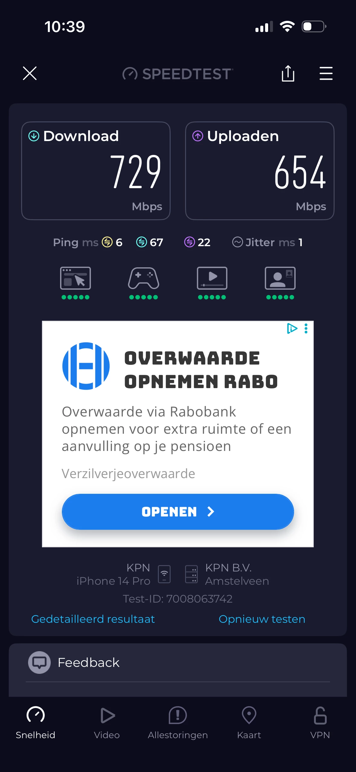 Vanavond even een testje uitgevoerd om aan te tonen dat wifi signalen ‘afnemen’ naarmate je verder weg ben van je modem. Ik heb een 1/1 Gbit/s verbinding, een iPhone 16 Pro, echter niet een modem van KPN, maar een FritzBox 4050 met WiFi6. De onderste snelheid een afstand van 30 cm, erboven een afstand van ongeveer een meter, de volgende ongeveer 3 meter, de bovenste ongeveer 5 meter. Er zijn meerdere apparaten op de wifi actief, waarvan één met muziek.