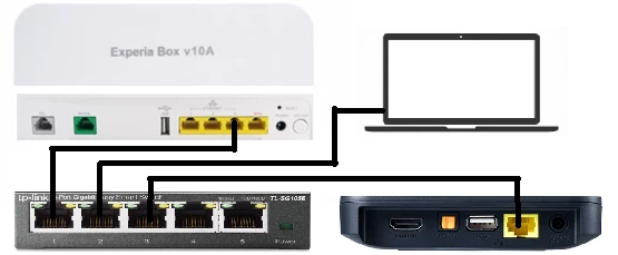 Je zegt “Heb je de gele ethernetkabel uit poort 3 van je ExperiaBox gehaald en rechtstreeks in je switch gestopt? Dan werkt het niet. Zorg dat de kabel van poort 3 (Experiabox) eerst naar je switch gaat.”