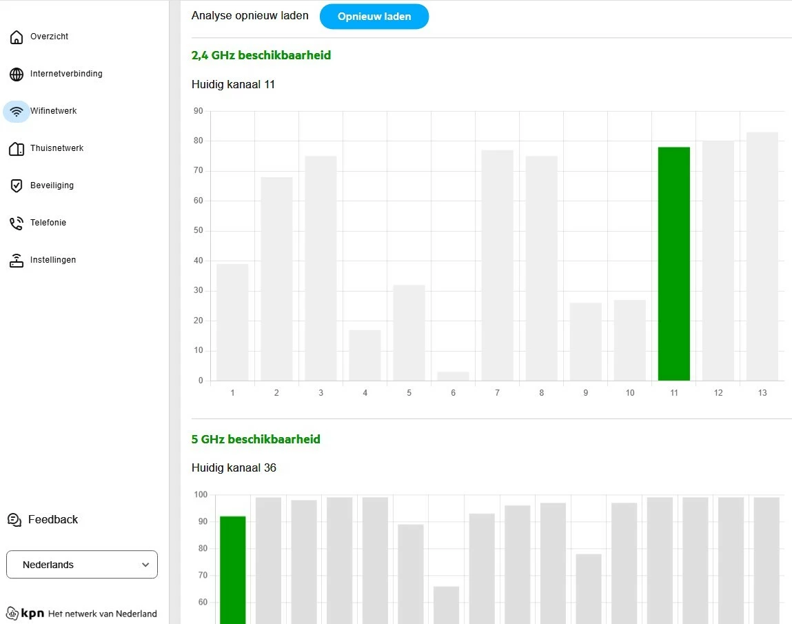 We zijn recent overgestapt van Ziggo naar KPN. Modem (KPN Box 12b) geïnstalleerd en op zich werkt de wifi, maar ik kom er nu achter dat de hoofdwifi alleen maar via 2,4 GHz uitzend. Als ik via een Wifi Analyzer app op mijn telefoon zoek, dan is er geen 5 GHz netwerk zichtbaar.