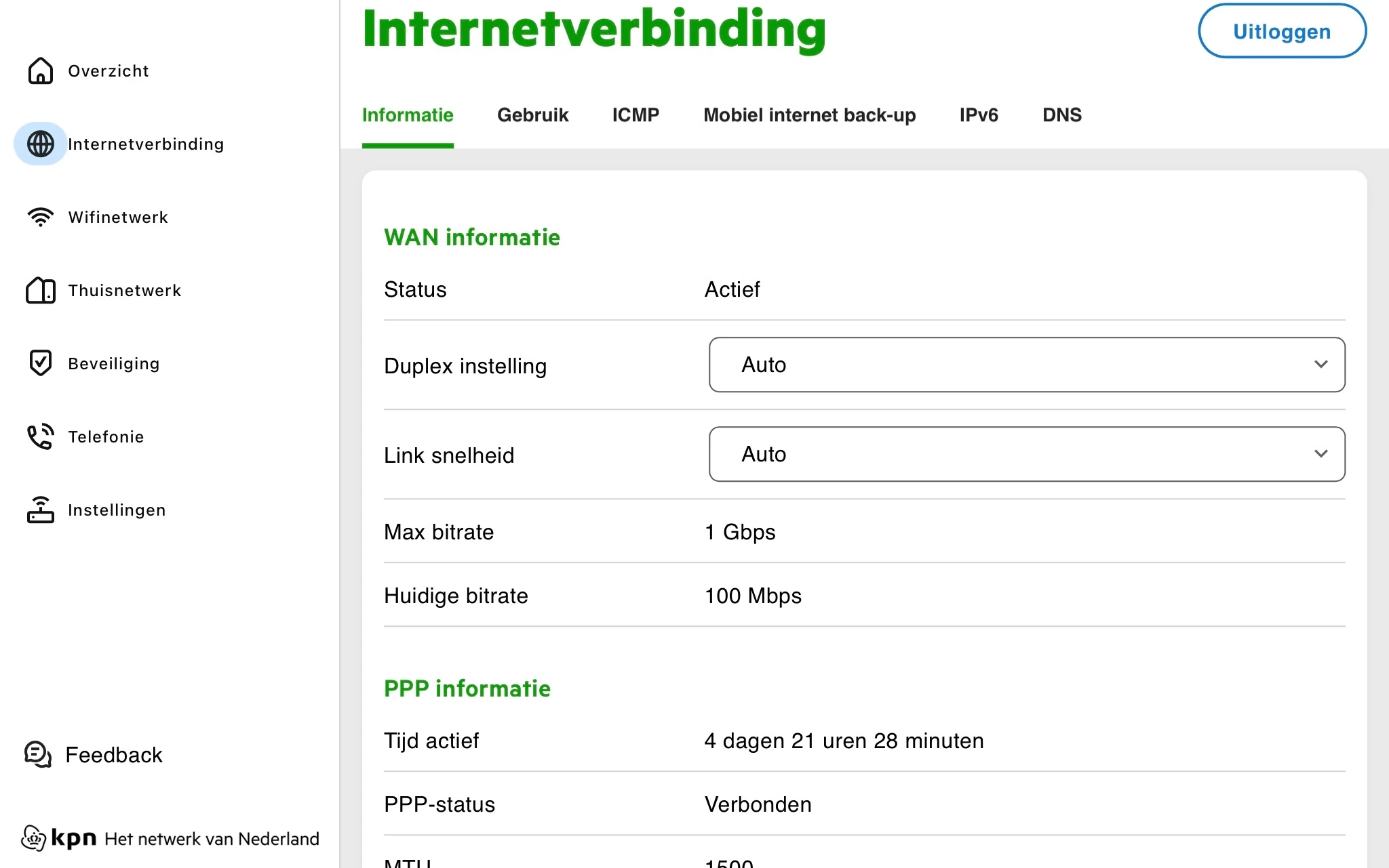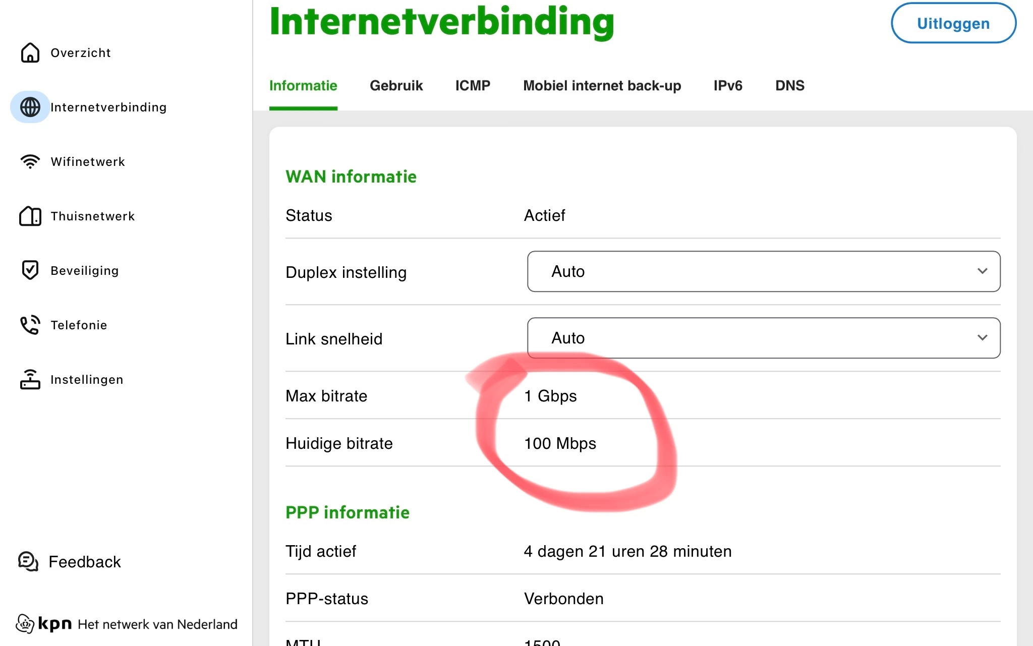 Ik heb vandaag een internetbox met een 1 Gbit/s-abonnement geïnstalleerd. De snelheid komt niet boven de 100 Mbit/s, zowel draadloos als bekabeld. Zelfs mijnmodem.kpn geeft aan dat het 100 Mbit/s is. Ik heb geprobeerd de box opnieuw op te starten, maar er veranderde niets.
