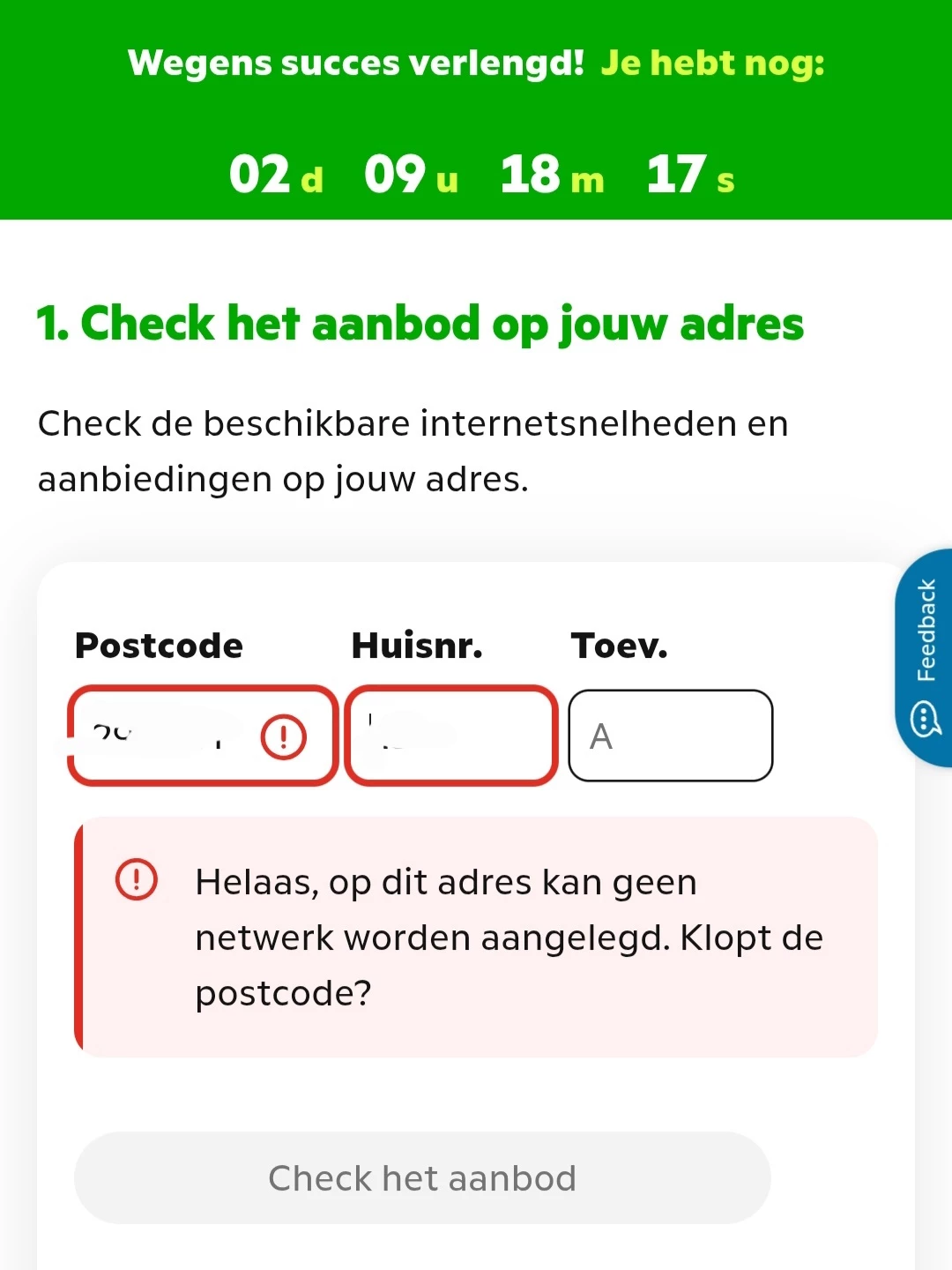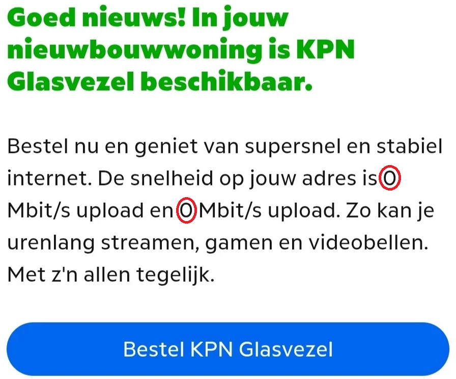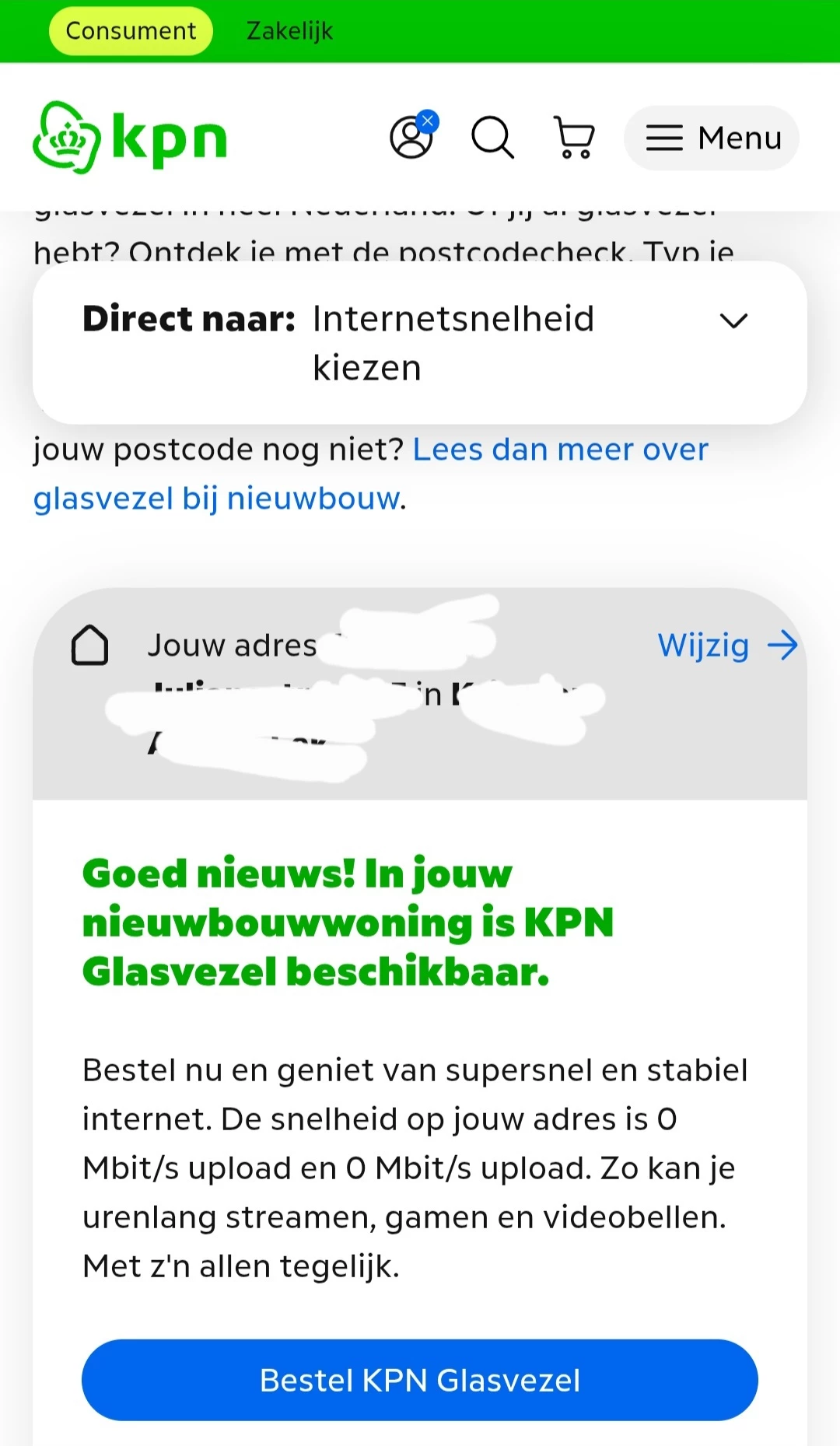 Als ik de glasvezel check doe geeft hij aan dat ik kpn glasvezel kan hebben, maar klik ik verder dan krijg ik te maken met helaas op dit netwerk kan geen netwerk worden aangelegd.