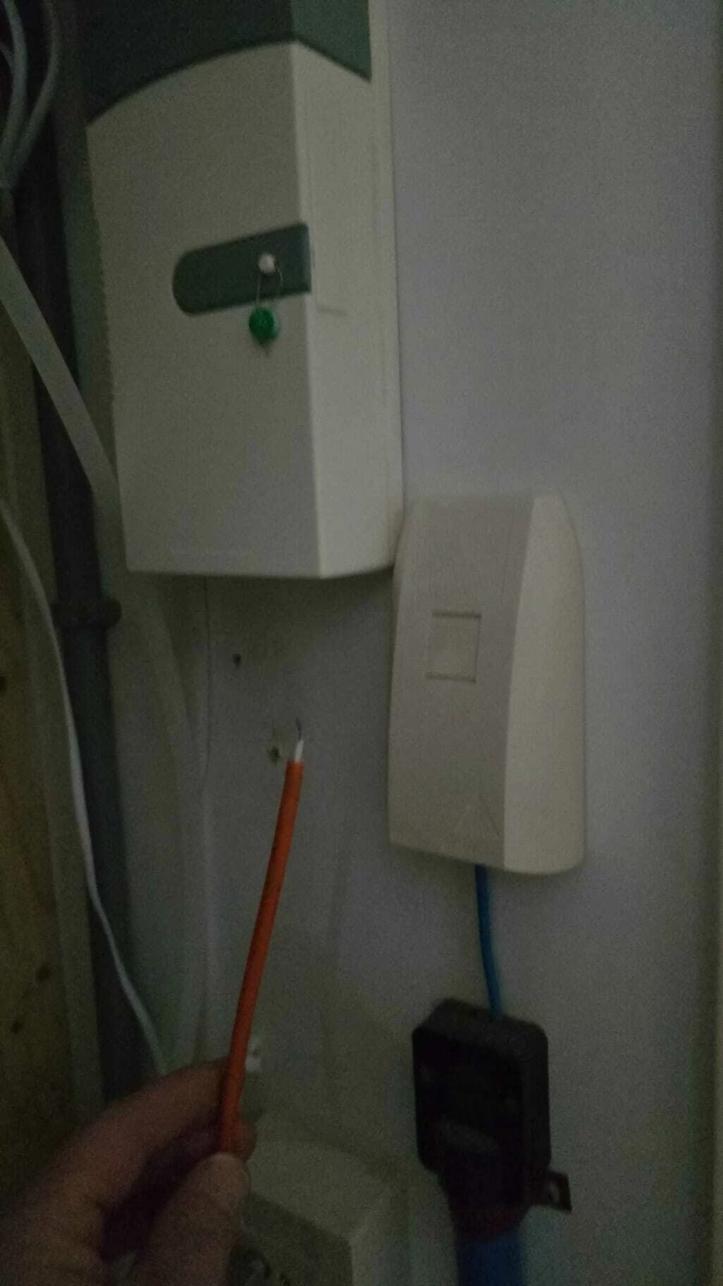 Links glasvezel FTU aansluitpunt met glasvezelkabel er onder. Is deze kapot of kan deze eenvoudig aangesloten worden? Rechts oude DSL lijn denk ik? Kan monteur die verwijderen?