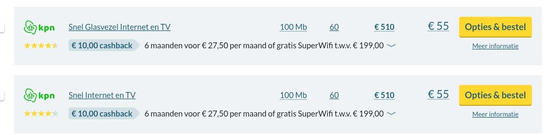 Allemaal leuk wat een vergelijkingssite opschrijft alleen als u die 100/10 zonder glasvezel wilt aanvragen gaat dat niet lukken. Er zijn geen glasvezel abonnementen, glasvezel (of koper) is een drager waarop het abonnement kan worden geleverd.