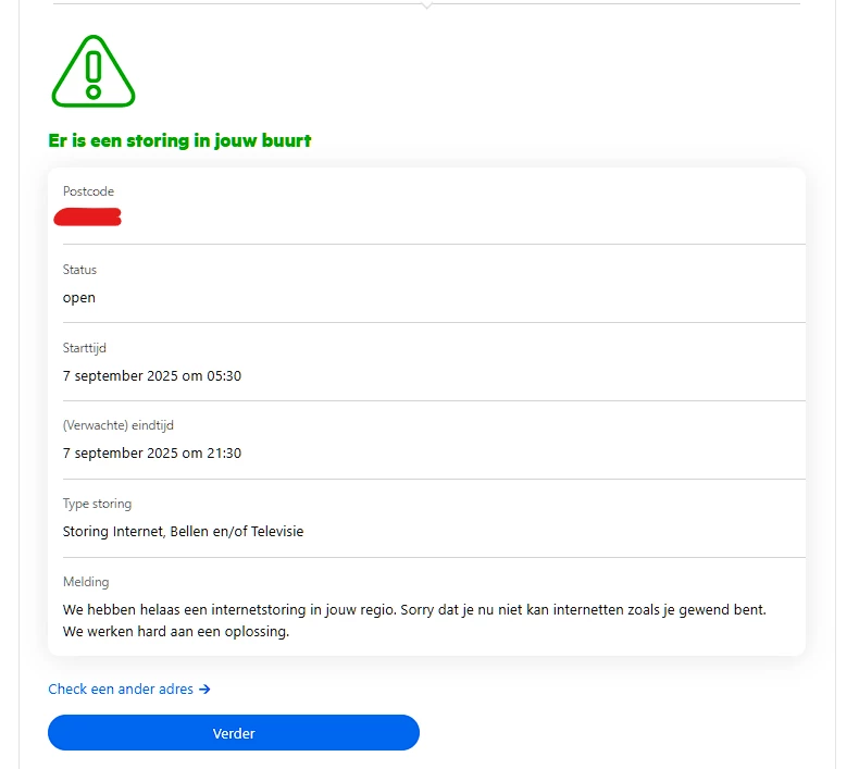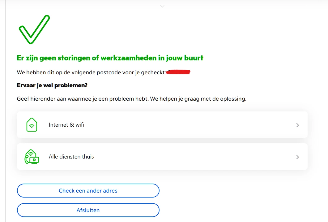 Nou, het is nog steeds niet helemaal lekker hoor. Ik kreeg vanochtend een SMS van een storing op mijn kantooradres. Je raad het nooit: al de hele dag geeft de storingschecker aan dat er op dat adres geen storing is, tenzij ik ingelogd ben. Lijkt mij ook niet helemaal de bedoeling, eerst roepen dat er niks aan de hand is maar pas als je doorklikt op de knop dat alles stuk is dan krijg je een login en dán komt de aap uit de mouw.. Als je echter op ‘Internet & wifi’ klikt kom je uit in bij de helppagina's die je écht niet gaan helpen.