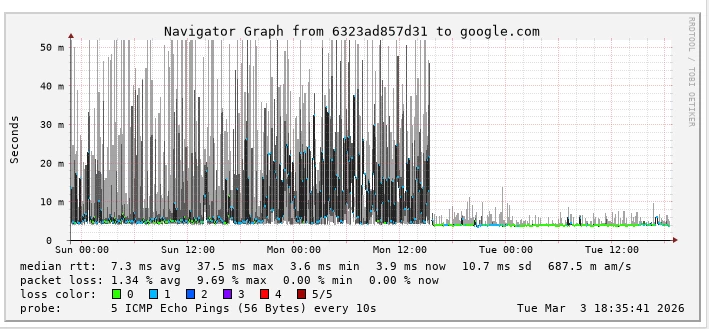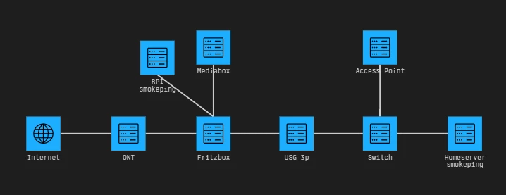 Ik heb sinds ik issues ben gaan merken een raspberry pi met smokeping aan de fritzbox gehangen, met wat probes richting het internet, het lokale netwerk zelf en de fritzbox. Hieruit blijkt dat er een aantal keer per minuut forse spikes in de ping en packet loss zitten, die één a twee seconden duren. Deze pieken zijn terug te zien richting het internet en richting de fritzbox, maar niet op het lokale netwerk. Deze pieken waren genoeg voor problemen met videobellen, en het kijken van livestreams. Hiernaast heb ik ook een smokeping instance op mijn homeserver draaien (deze hangt achter de USG), waarop ik dezelfde resultaten zie.