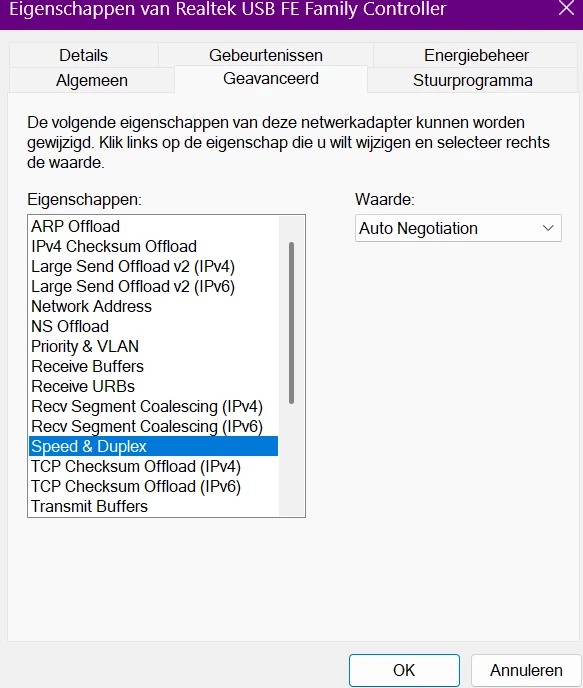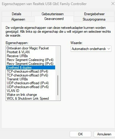 Daar kun je zien hie de snelheid ingesteld staat en kun je aanpassen naar auto of gigabit.