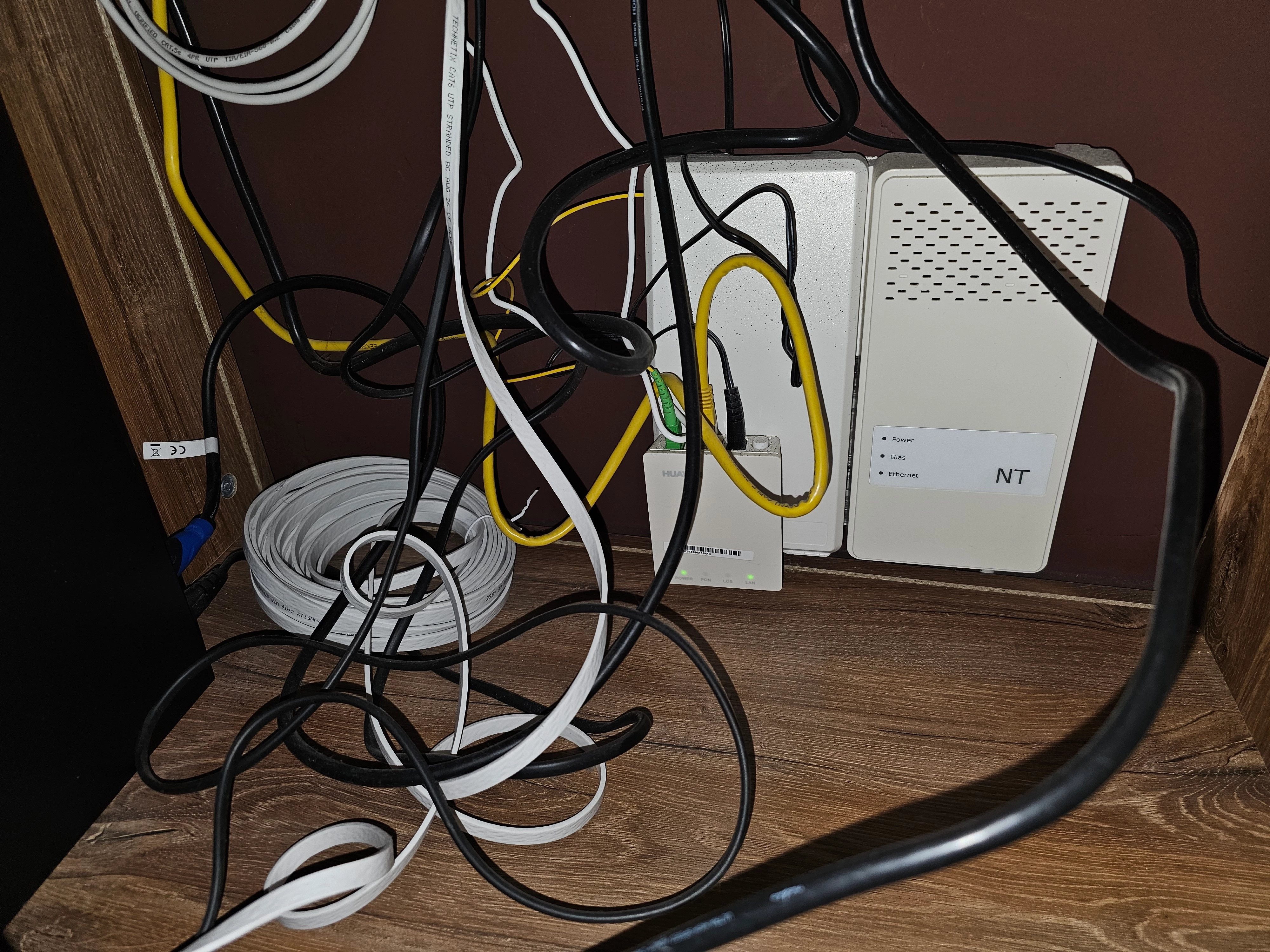 Ik heb de kastjes bewust scheefgezet, zodat de rode kabel meer ruimte heeft en los hangt en geen spanning ondervindt door de plank eronder. Anders paste hij namelijk niet in het kastje. Bij odido zaten de kabels voorop. Ik voel er niet zoveel voor een uitsparing in mn kast te zagen of deze verder naar voren te zetten.