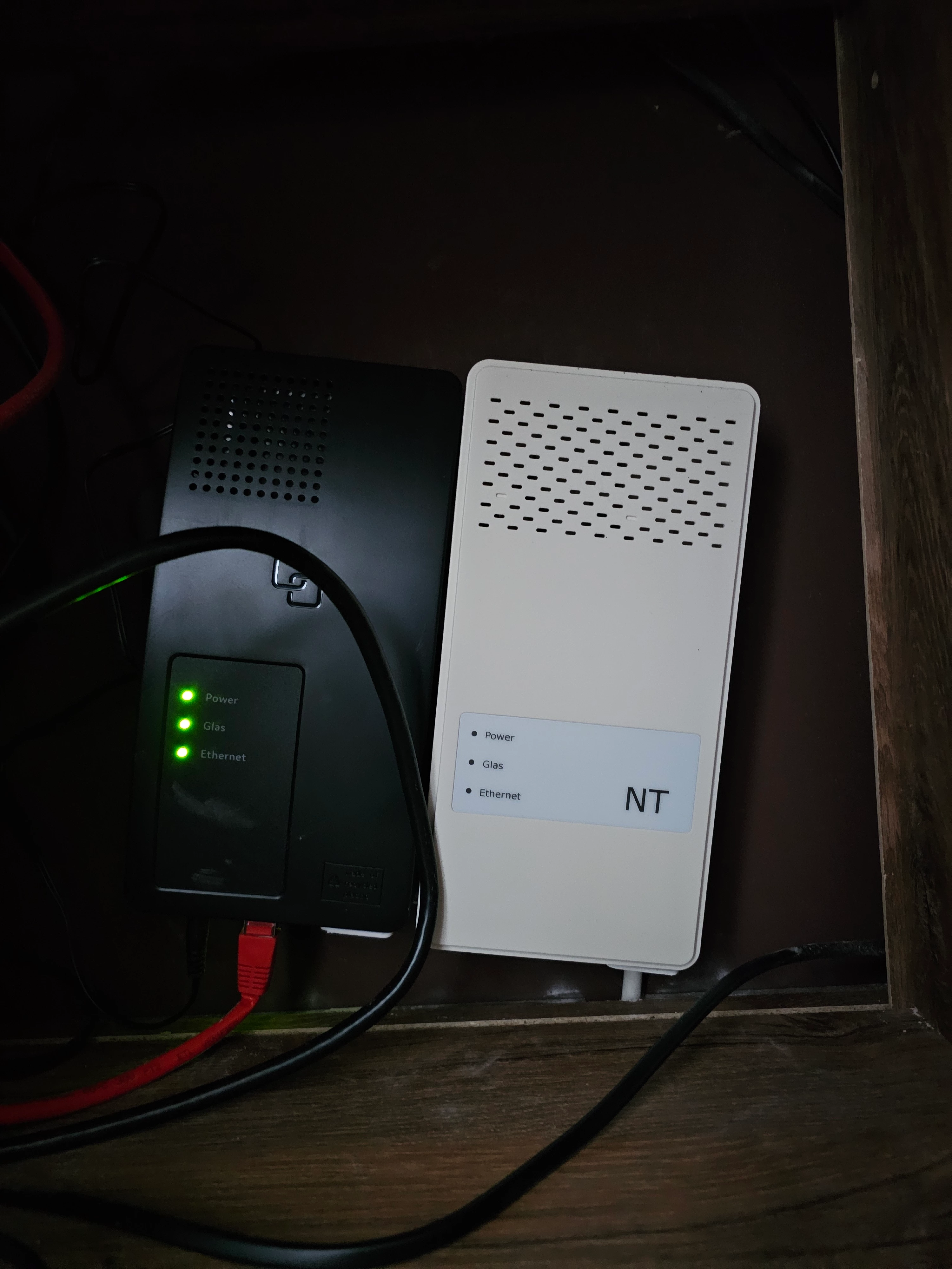 Maar ik vind de glasvezelaansluiting met 2 NT kastjes wel erg scheef hangen.
