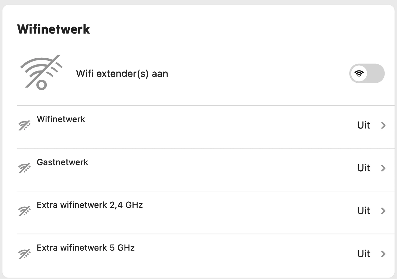 Op de beginpagina, genaamd overzicht, kun je de wifi uitzetten en krijg je de vraag alleen op dit apparaat, modem dus, of tevens op alles wifi extenders. ​@supernovaĀ