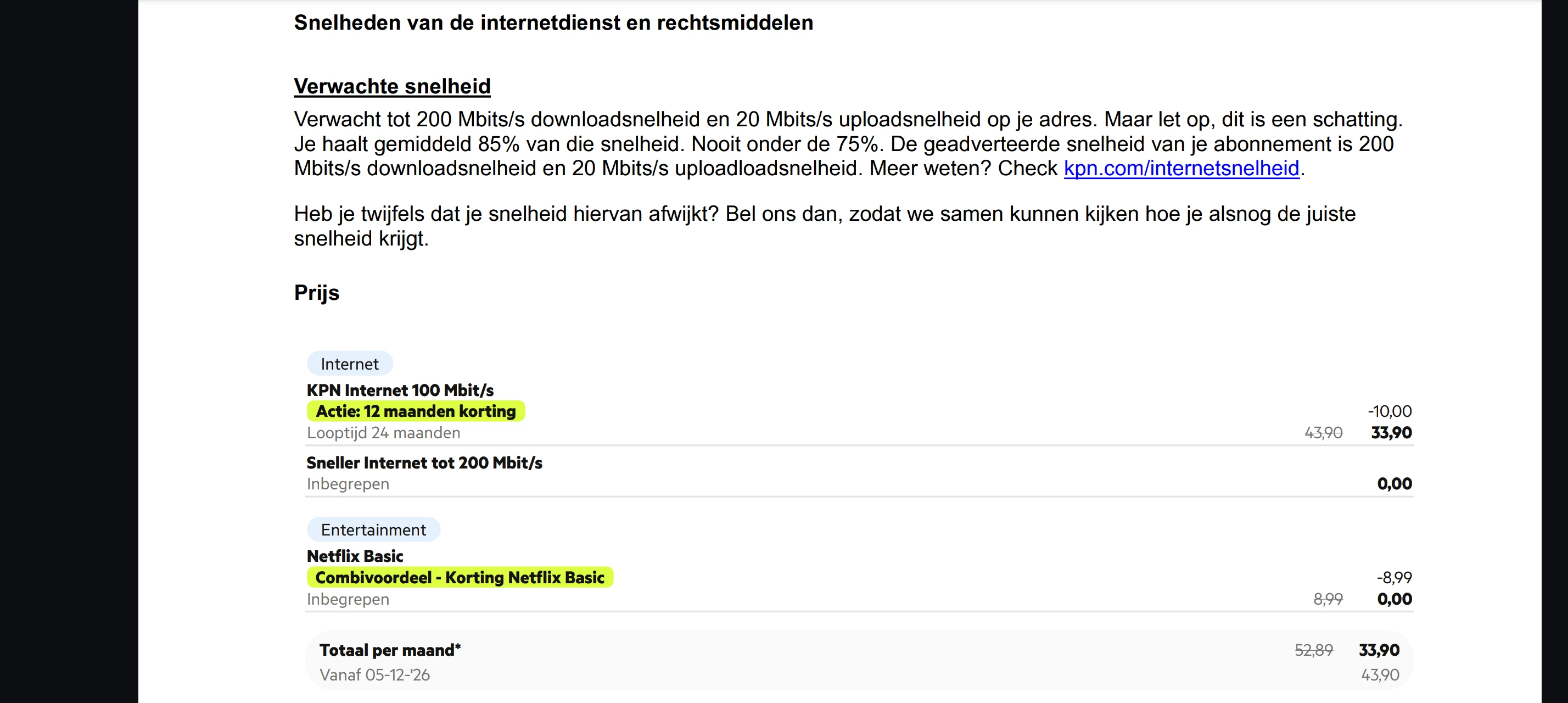 In december zijn wij een tweejarig contract aangegaan voor internet en twee mobiele abonnementen. De basis van dit contract was 100 Mbit/s met een eerder verkregen gratis upgrade naar 200 Mbit/s. Deze upgrade was voor ons de doorslaggevende reden om voor KPN te kiezen.
