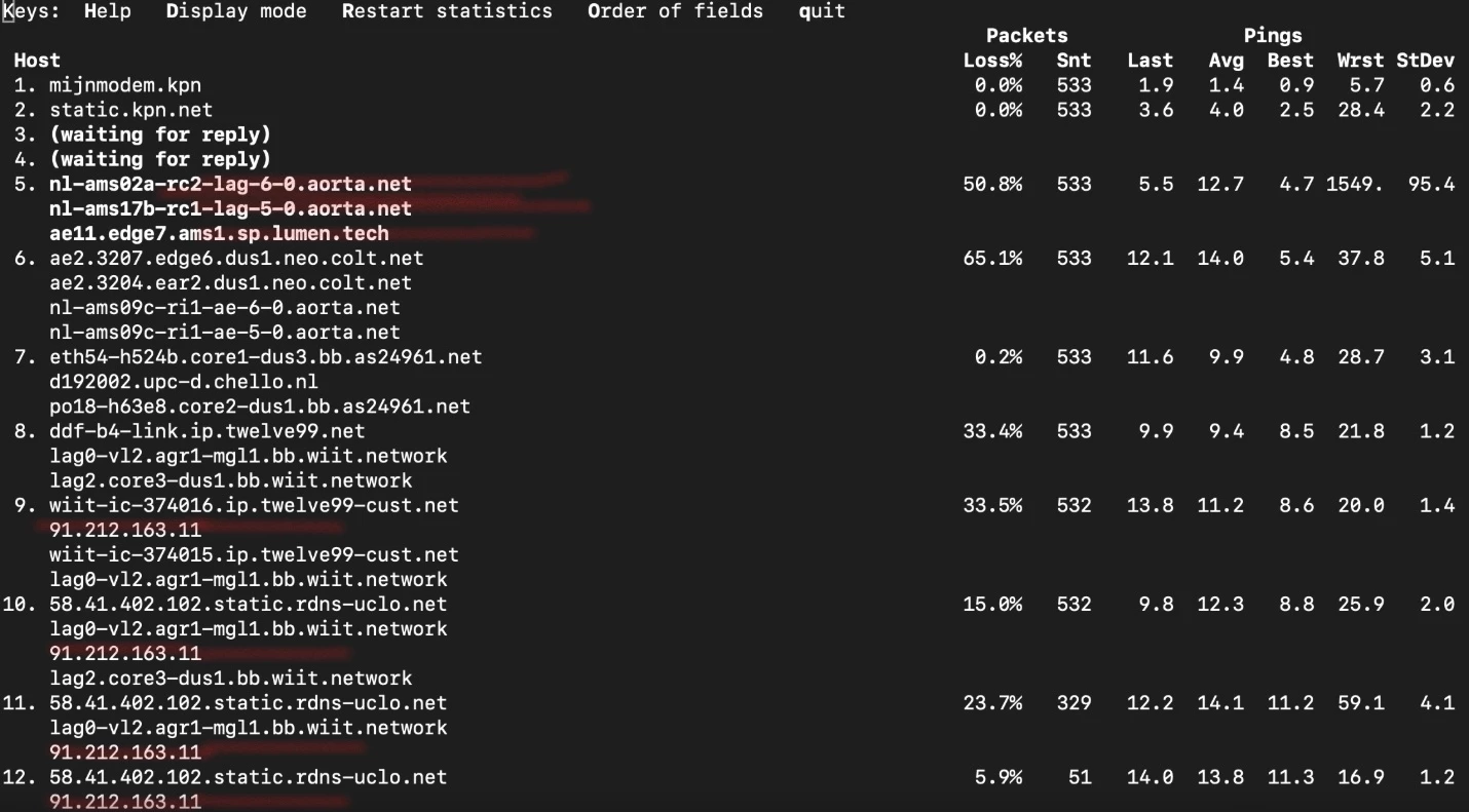 Ik heb last van package loss als ik game via Boosteroid. Volgens de klantenservice aldaar licht dat aan “The packet loss is caused by congested transit routes (Twelve99 / AS24961) on the way to Boosteroid”. Dit zou volgens hen de service provider, in dit geval KPN, moeten kunnen oplossen. Zie hieronder een gedetailleerd MRT rapport voor de verschillende hops: