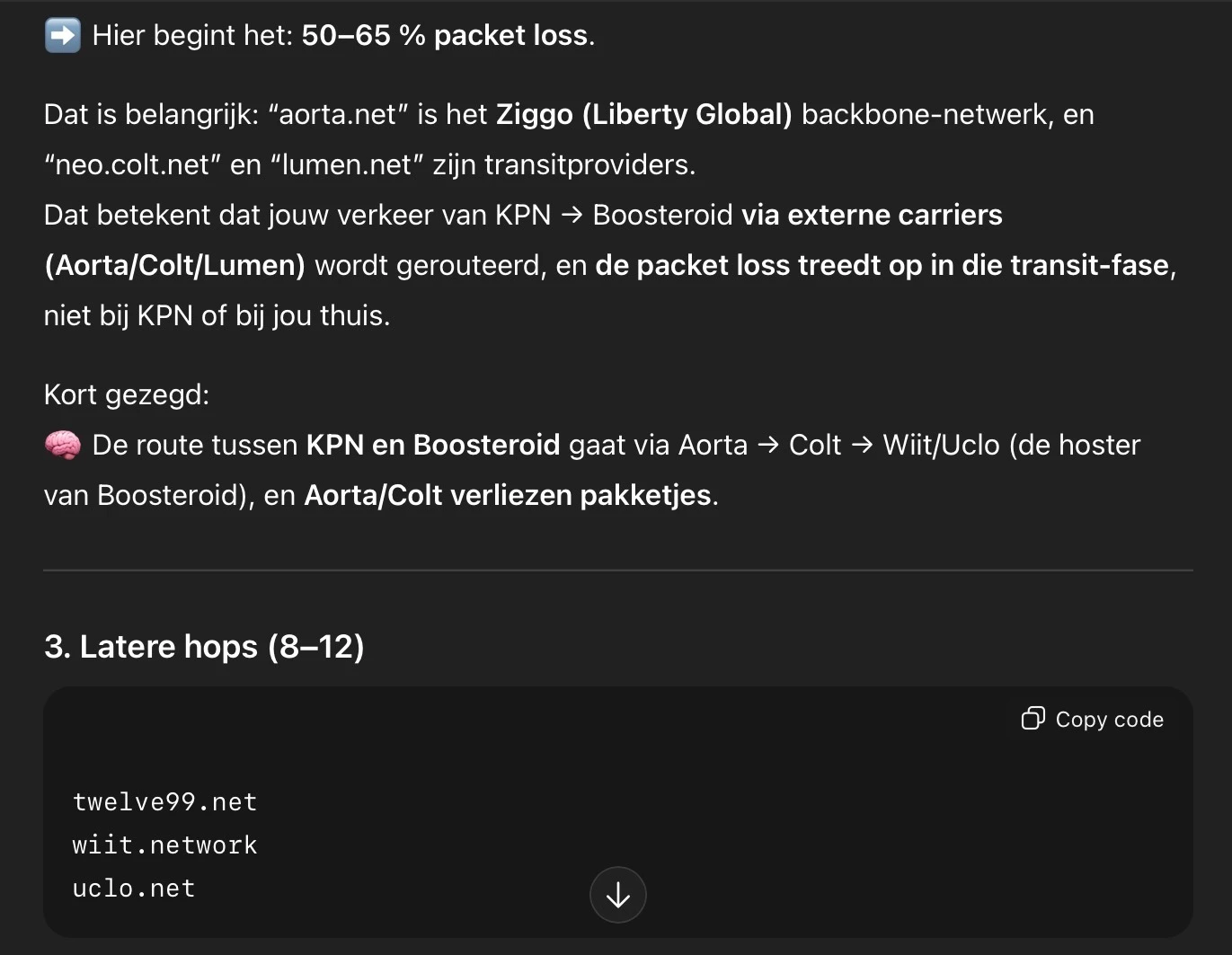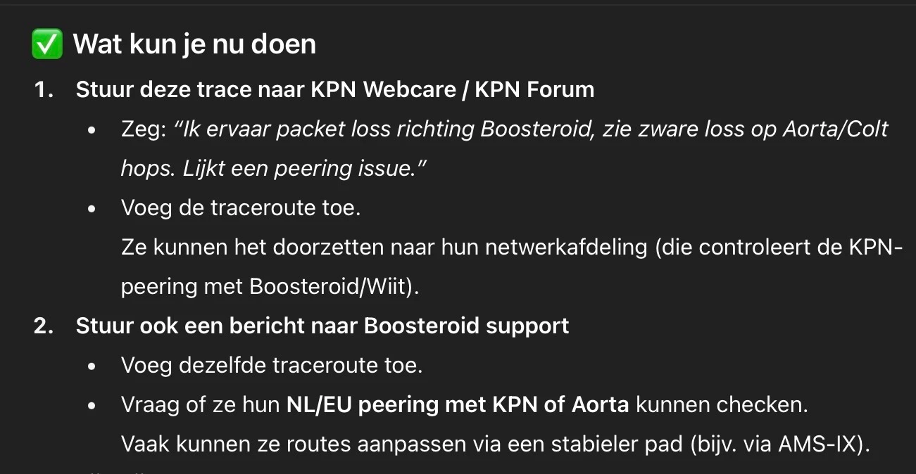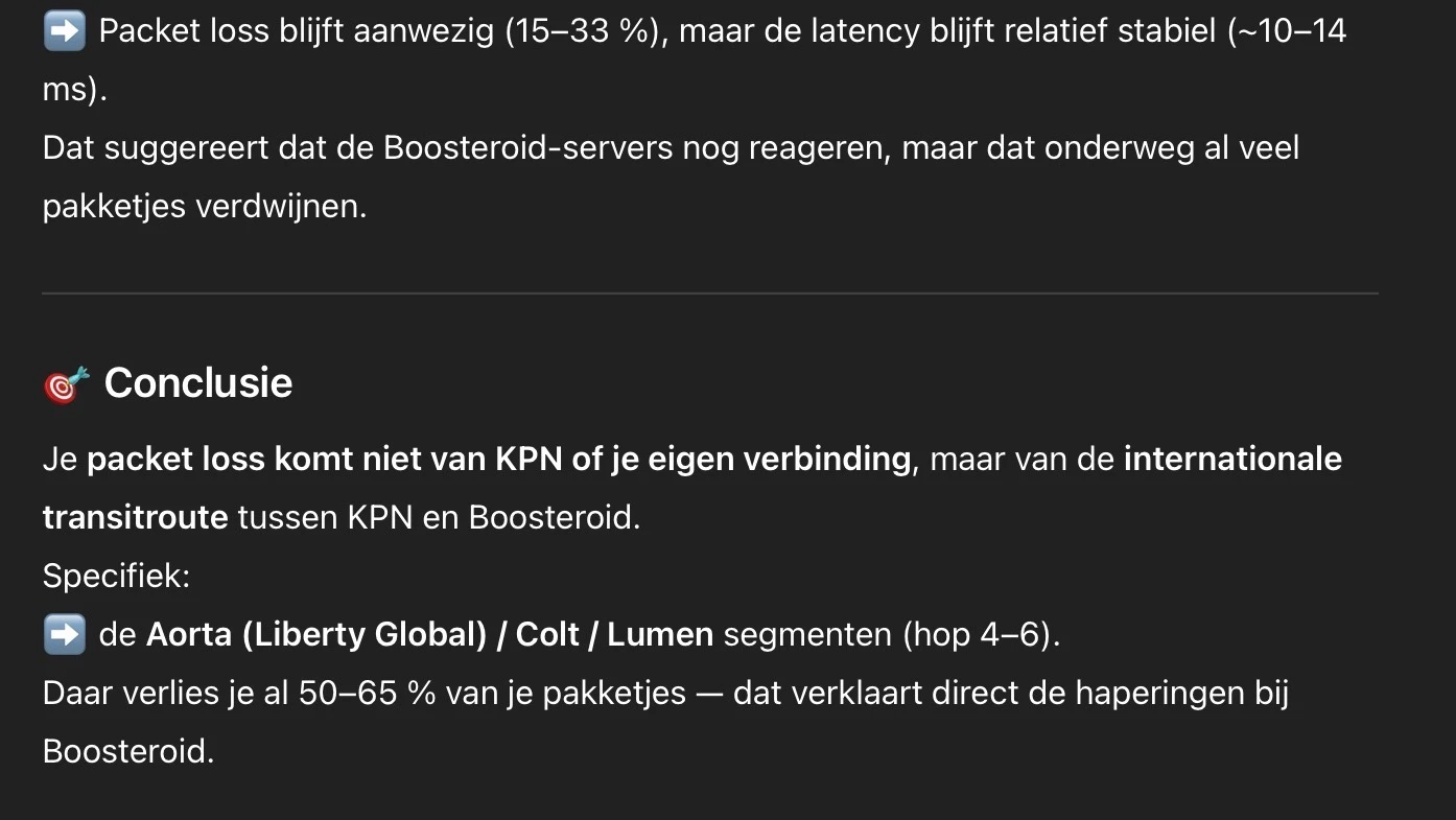 Dank. De rest van de verbinding werkt wel stabiel en uitzetten van ipv6 helpt ook niet. Zie hieronder de info van ChatGPT dat er toch pakketjes verdwijnen tussen KPN en boosteroid.