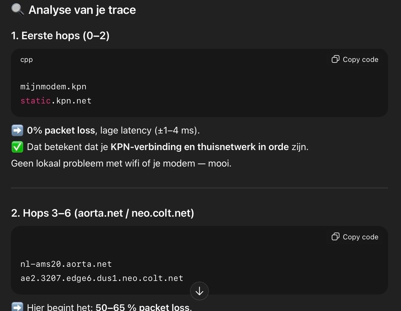 Ik heb nogmaals een MTR test gedaan en het in ChatGPT gegooid. Het ligt er toch echt aan dat KPN een hele slechte route gebruikt om dit verkeer te routen. Zie output hieronder.