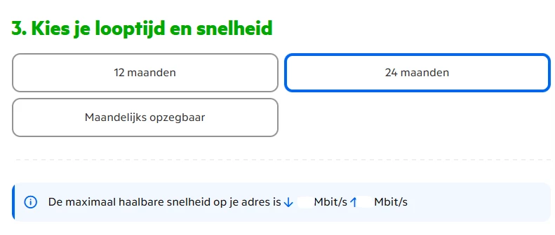 Als je jouw adres invult op https://www.kpn.com/shop/pakket-zelf-samenstellen en dan een stukje naar beneden gaat naar het kopje ‘Kies je looptijd en snelheid’, wat voor verwachte snelheid staat daar dan in het lichtblauwe balkje?