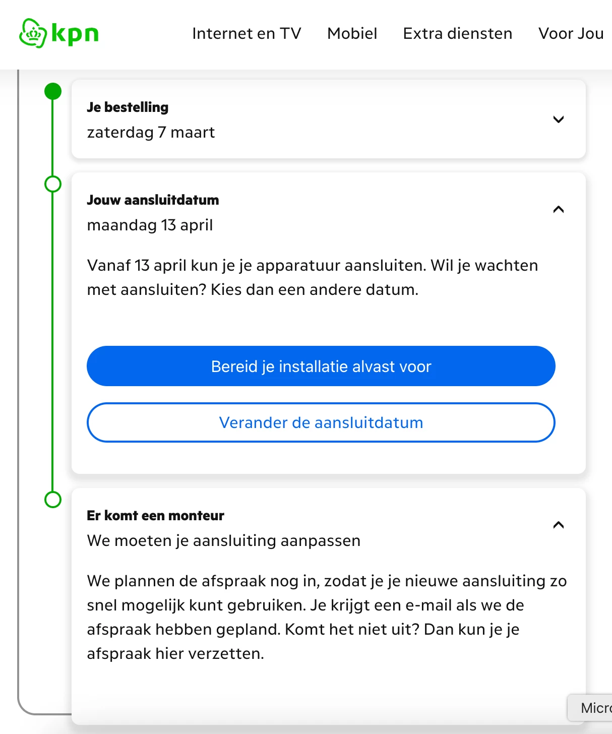 Wat ik hier nu zie, ​@Leo., is dat de oplevering van de wijkcentrale vanuit de netwerkafdeling gepland staat voor 13 april. Als dat lukt en ook snel administratief verwerkt wordt, dan kunnen jouw diensten een dag of twee later opgeleverd worden. De back office houdt het in de gaten en neemt contact met je op als er andere of aanvullende informatie beschikbaar komt.