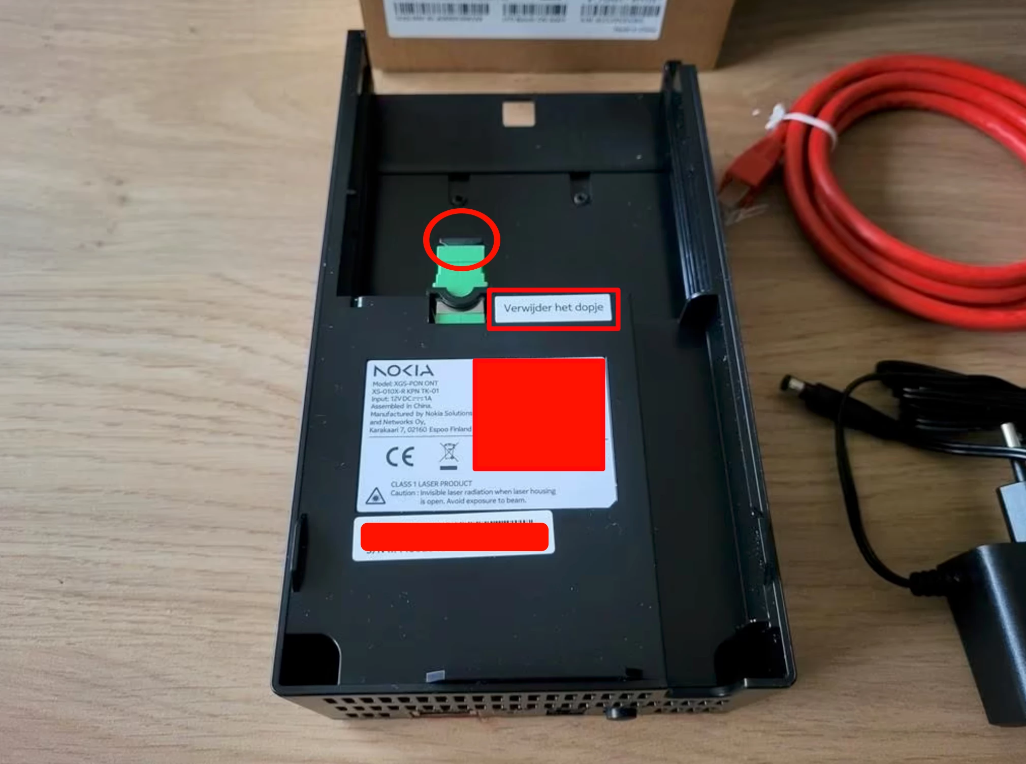 heb je het zwarte dopje uit de groene aansluiting gehaald van de Nokia ONT?