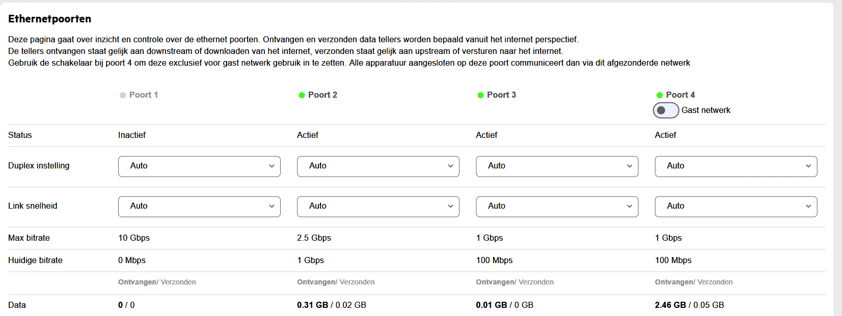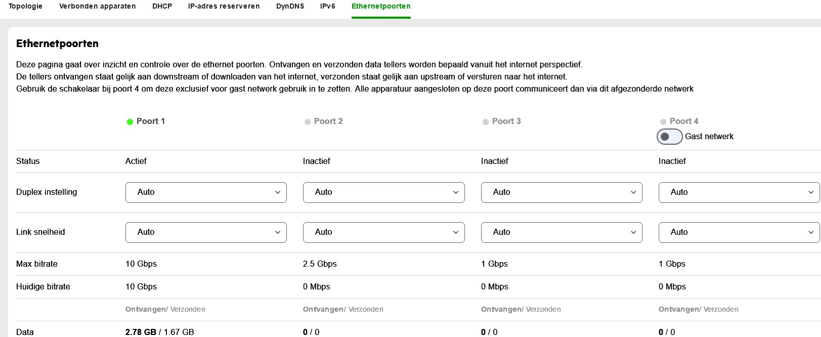 Ik heb niets aangesloten op poort 2 en dan zie je ook 0 Mbps