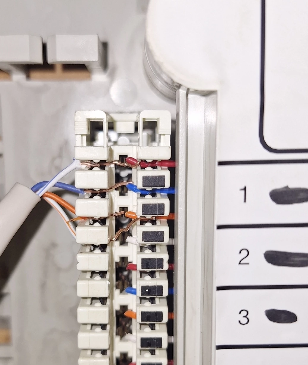 Moet dan ook de bovenste rode de blauwe kabel komen en de blauwe daaronder de witte of begint de lijn1 van rood-blauw-oranje-wit en dan weer opnieuw?